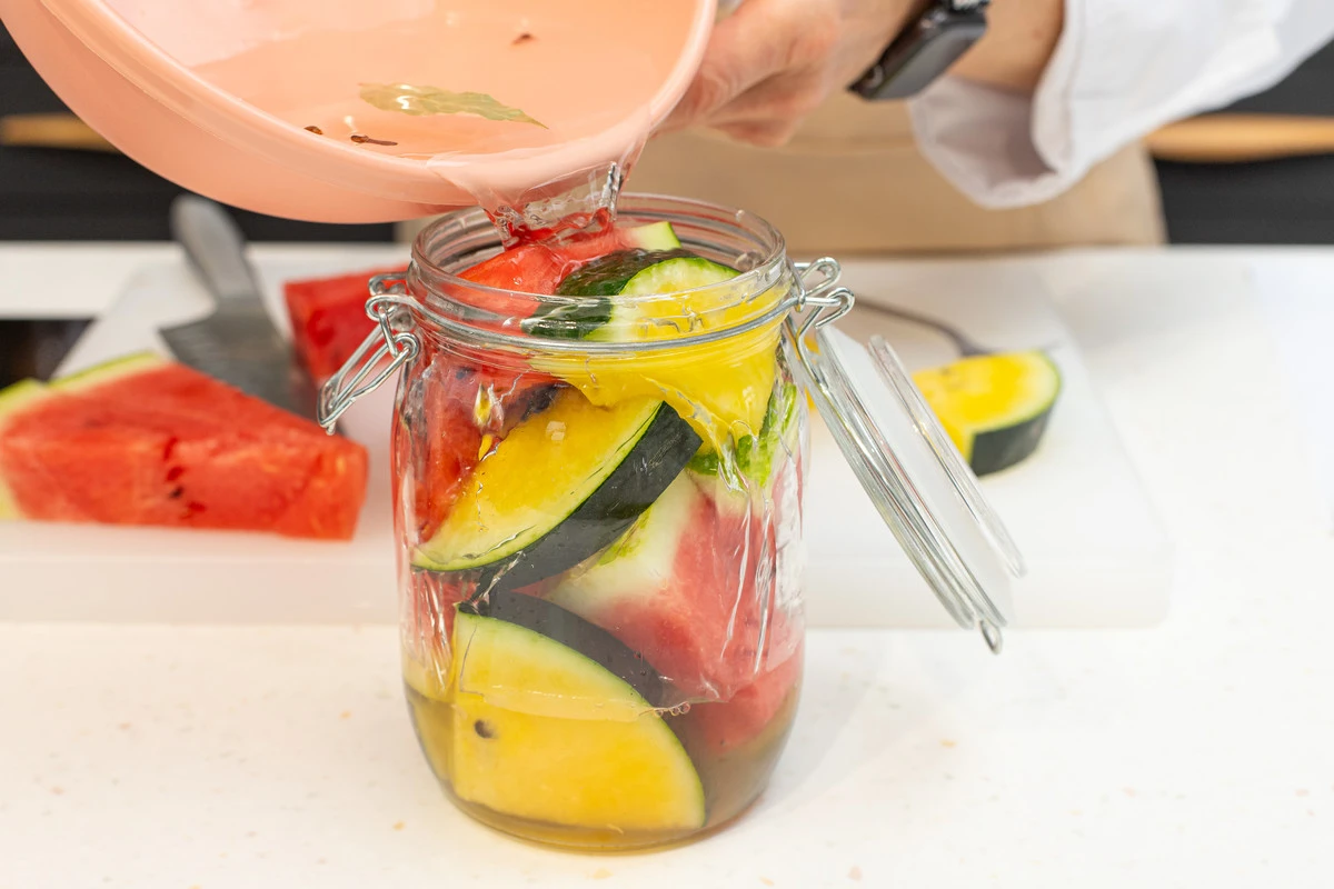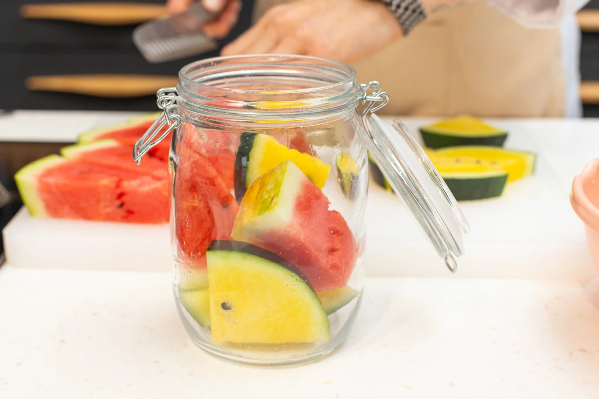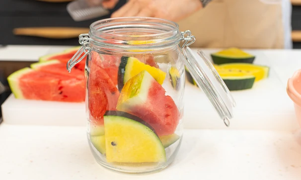 Аккуратно разложите кусочки арбуза по банкам так, чтобы они лежали как можно плотнее, но при этом не повредились и не начал вытекать сок.
