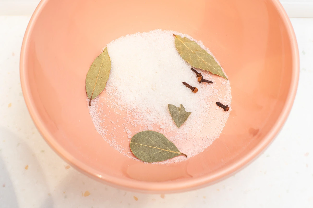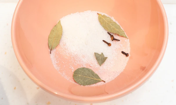 Смешайте лимонную кислоту, сахар и соль, залейте водой и размешайте до полного растворения сыпучих ингредиентов. Добавьте лавровый лист и гвоздику.