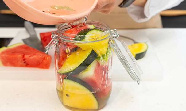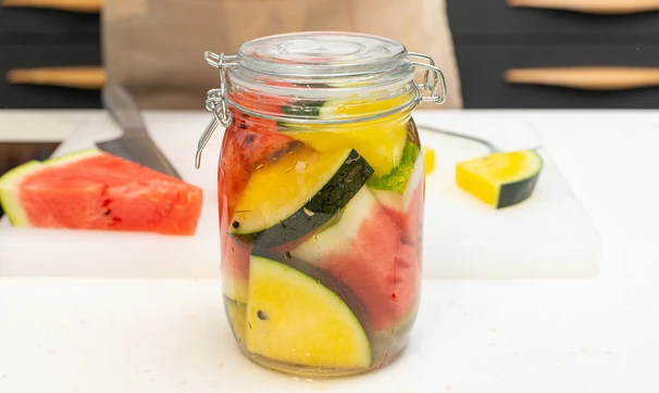 Интересная закуска — быстрые маринованные арбузы. Почему мы назвали их «для ленивых»? Потому что в этом рецепте не нужно стерилизовать банки, несколько раз кипятить воду, долго возиться — просто смешайте ингредиенты для маринада и залейте арбузы.