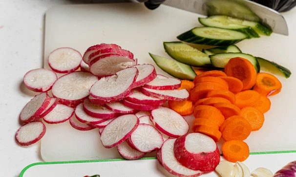 Морковь очистите. Нарежьте тонкими кружочками морковь и дайкон.