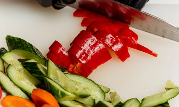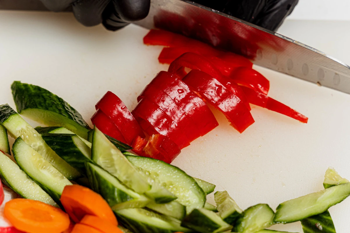 Огурец и сладкий перец нарежьте брусочками. У острого перца удалите семена, нарежьте перец колечками.