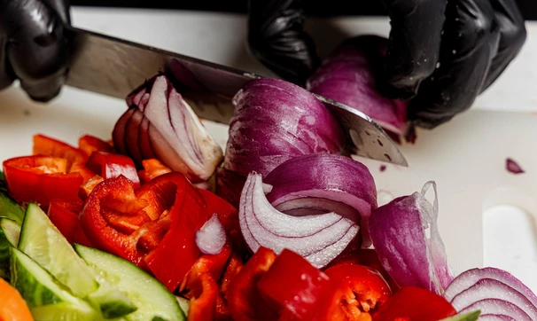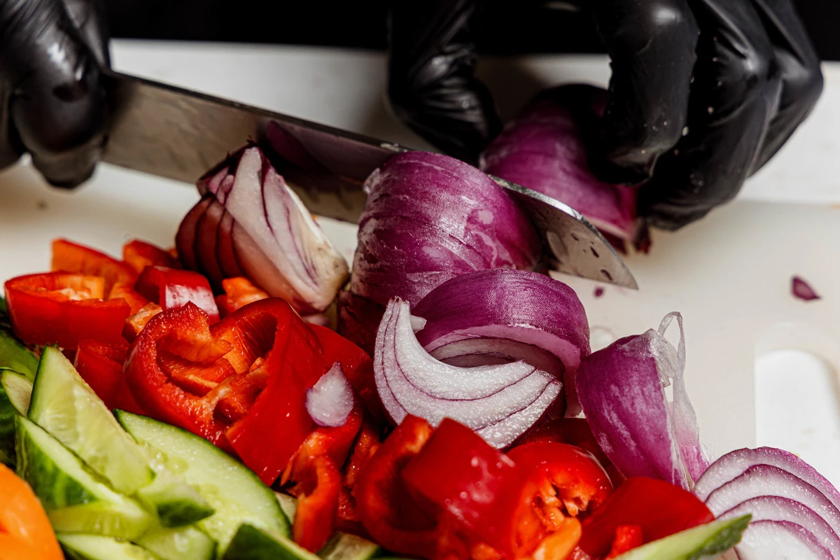 Красный лук очистите и нарежьте перьями. Зубчики чеснока очистите от шелухи, разрежьте на половинки и удалите зелёную сердцевину.