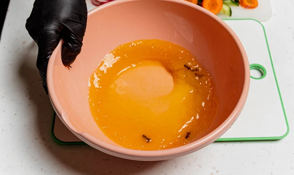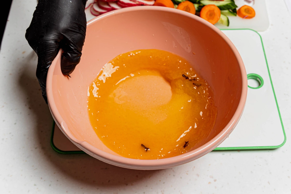 Смешайте уксус, соль, сахар и специи, добавьте 100 мл воды.