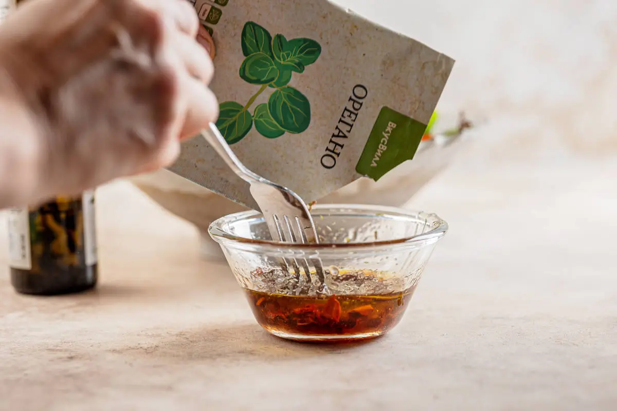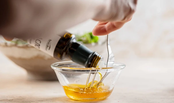 Смешайте мёд, оливковое масло и сок лимона, взбейте вилкой.
