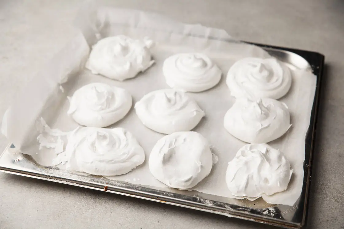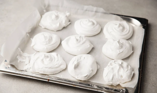 Застелите противень пергаментом и выкладывайте белки, можно через кондитерский мешок или при помощи двух ложек, формируя небольшие круглые безе.