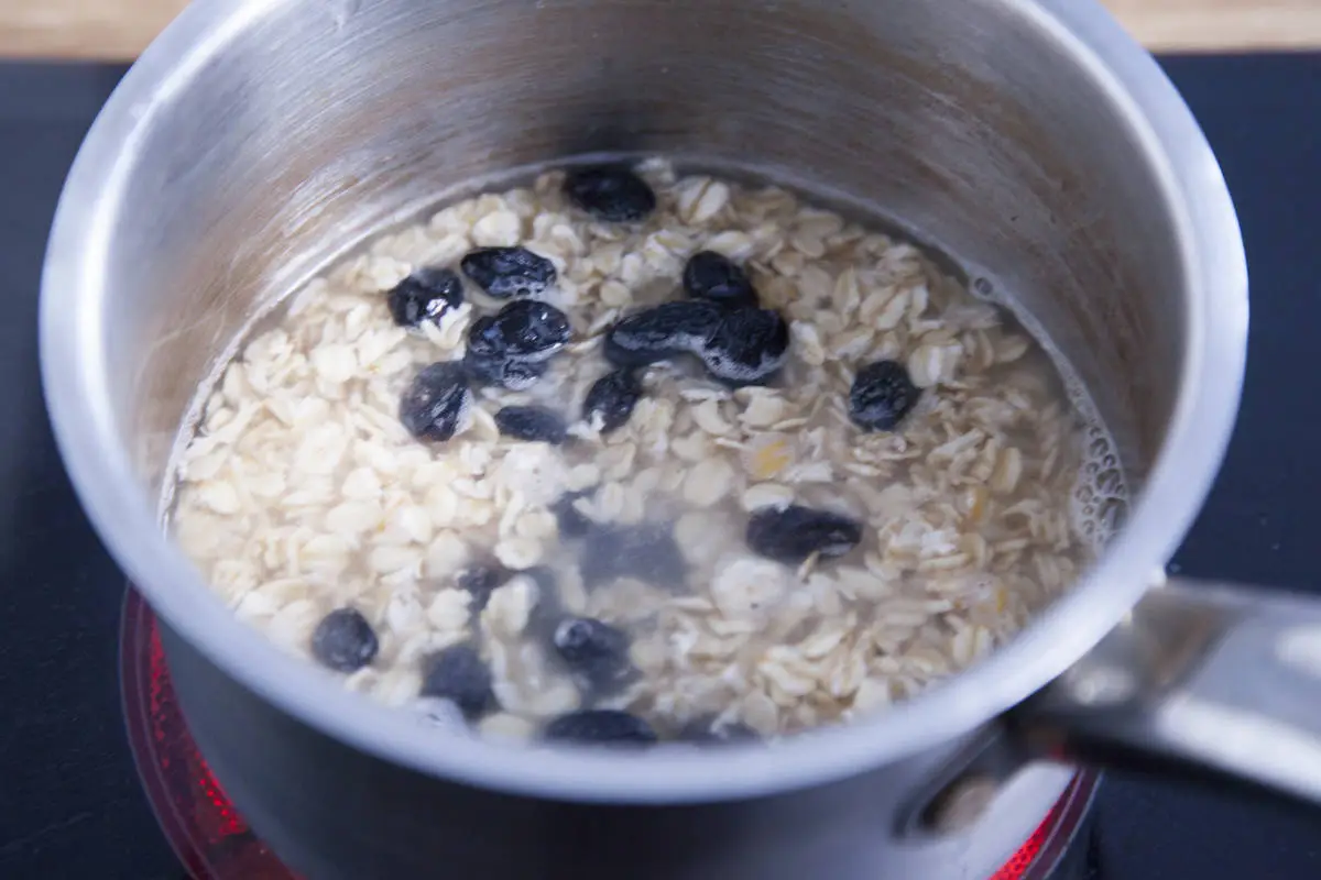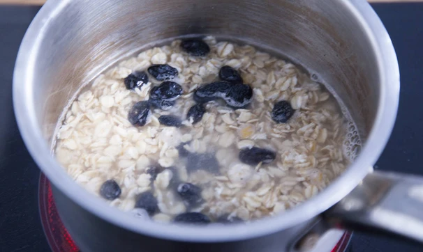 Овсяные хлопья, промытый изюм и сахар залейте водой и варите до готовности каши, около 15-ти минут.