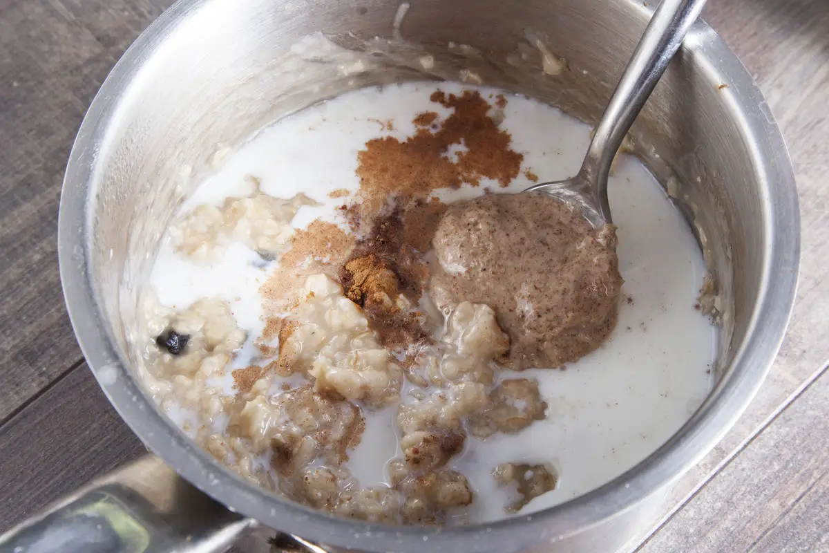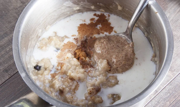 Затем добавьте молоко, урбеч и корицу, размешайте. Приятного аппетита!