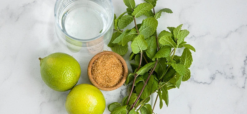 Лаймы нарежьте дольками. У мяты оборвите листья, немного верхних листьев оставьте для украшения.