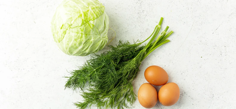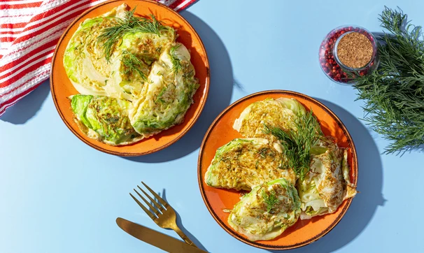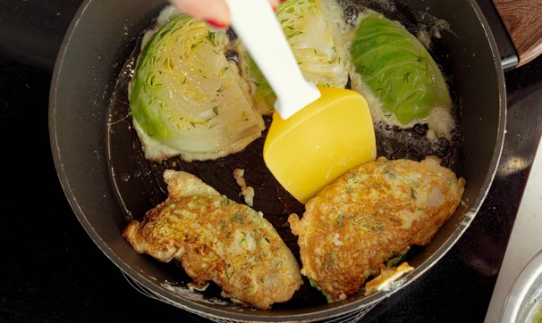 Ещё одно блюдо из детства — жареная в яйце молодая капуста. Мягкая и нежная внутри, с аппетитной корочкой снаружи.