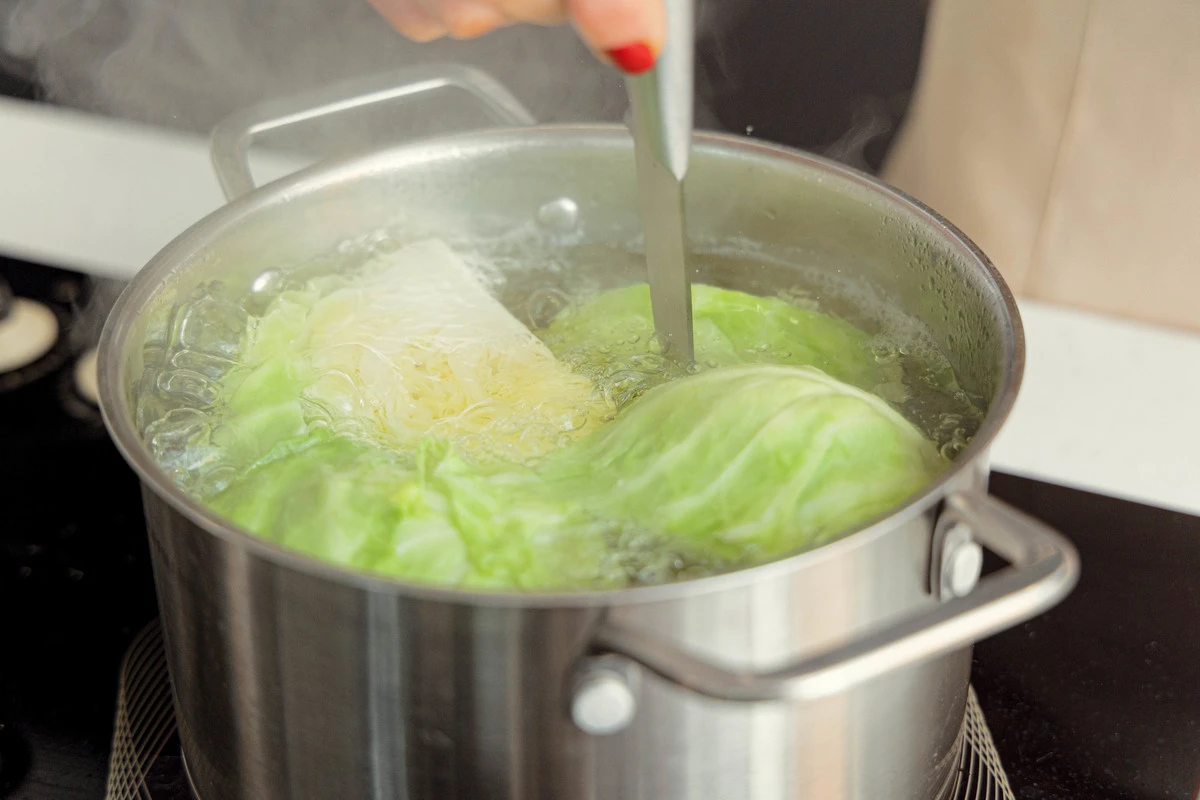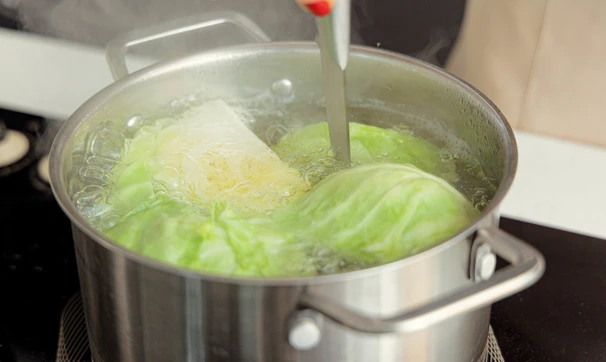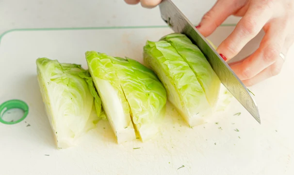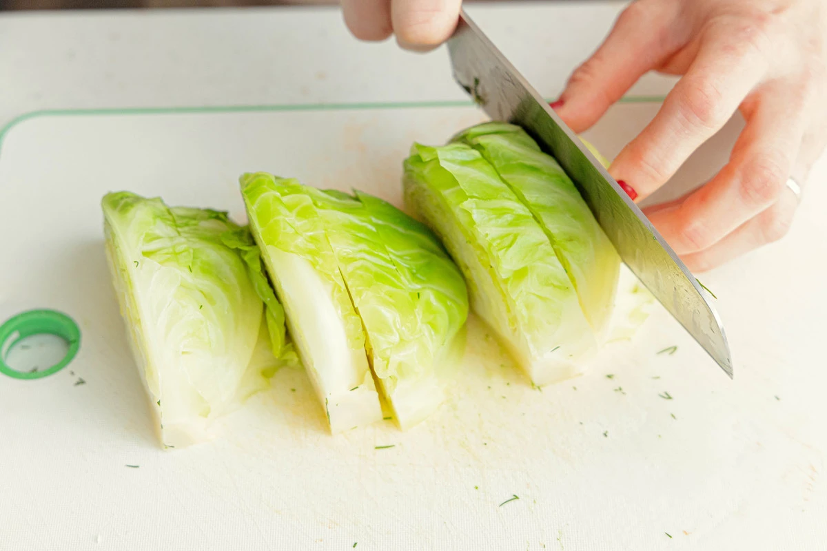 Молодую капусту разрежьте на четвертинки вдоль, сохраняя кочерыжку, чтобы листья держались вместе. Вскипятите подсоленную воду в кастрюле и отварите капусту до мягкости, это займёт 2-3 минуты.