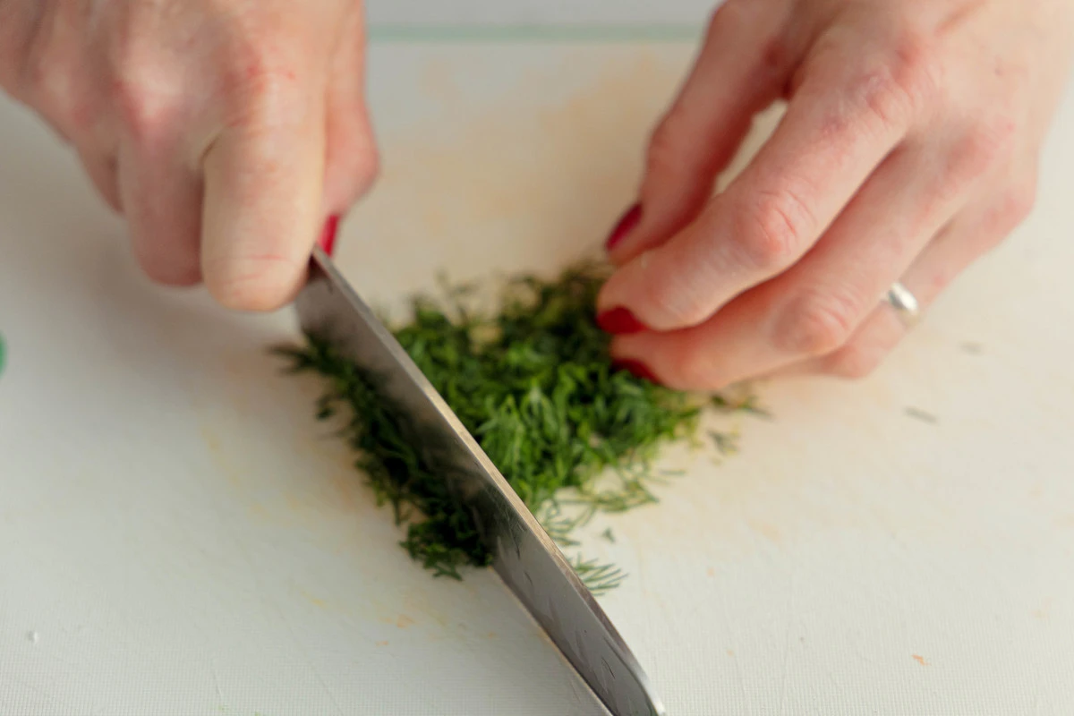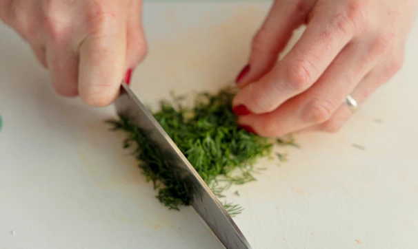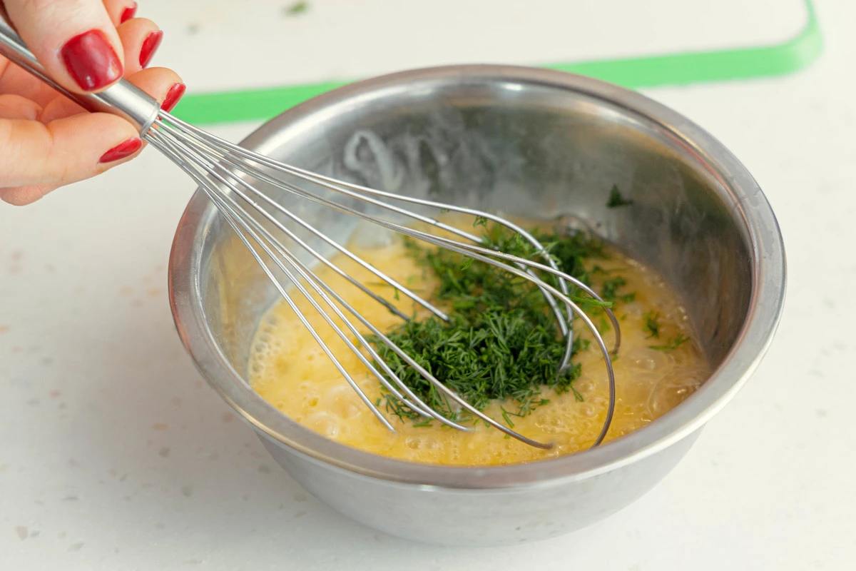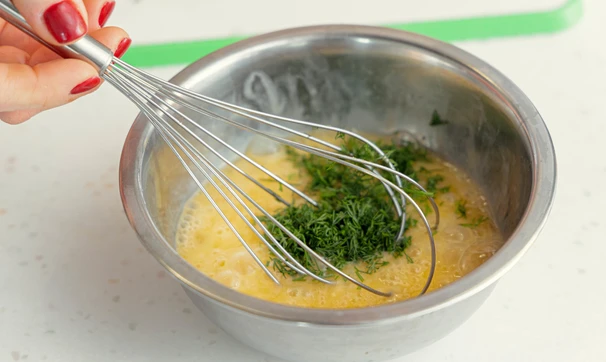 Яйца разбейте в мисочку. Смешайте яйца с укропом и взбейте вилкой.