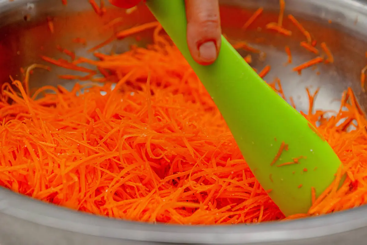 Вылейте горячую смесь на морковь. Сразу перемешайте, оставьте в контейнере остывать.