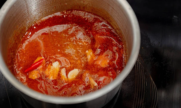 В сотейнике смешайте растительное масло и уксус, добавьте специи и измельчённый чеснок.