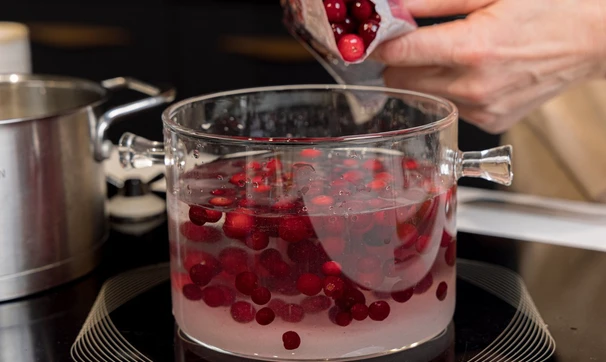 Положите клюкву, предварительно размораживать не нужно.