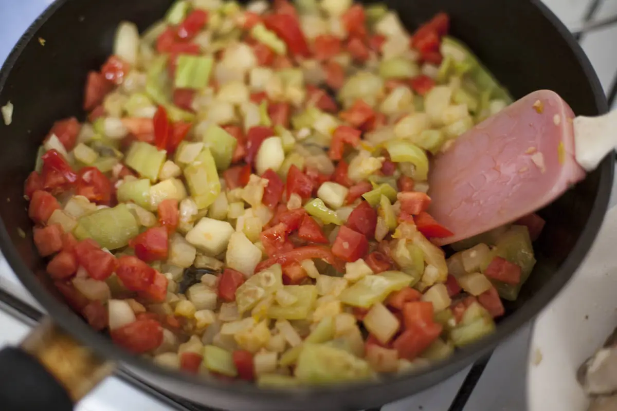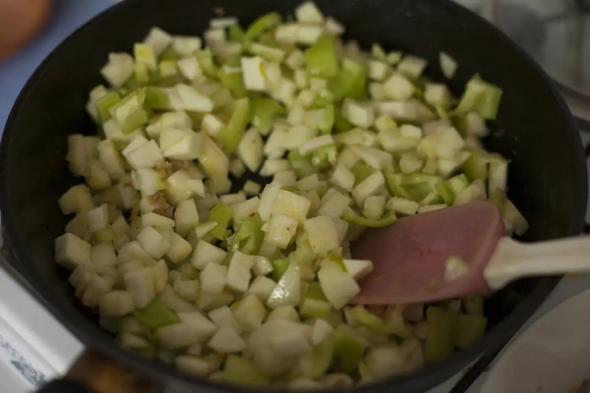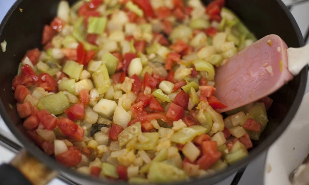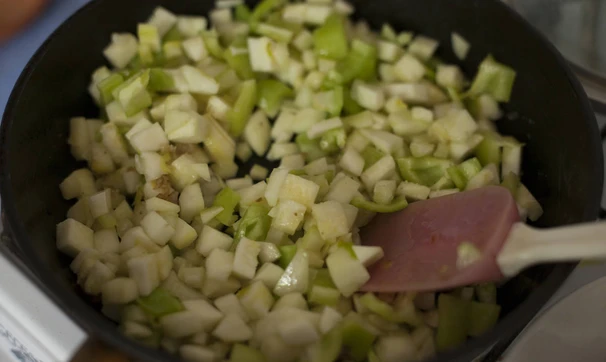 В оставшемся масле обжарьте кабачок, перец и сельдерей.