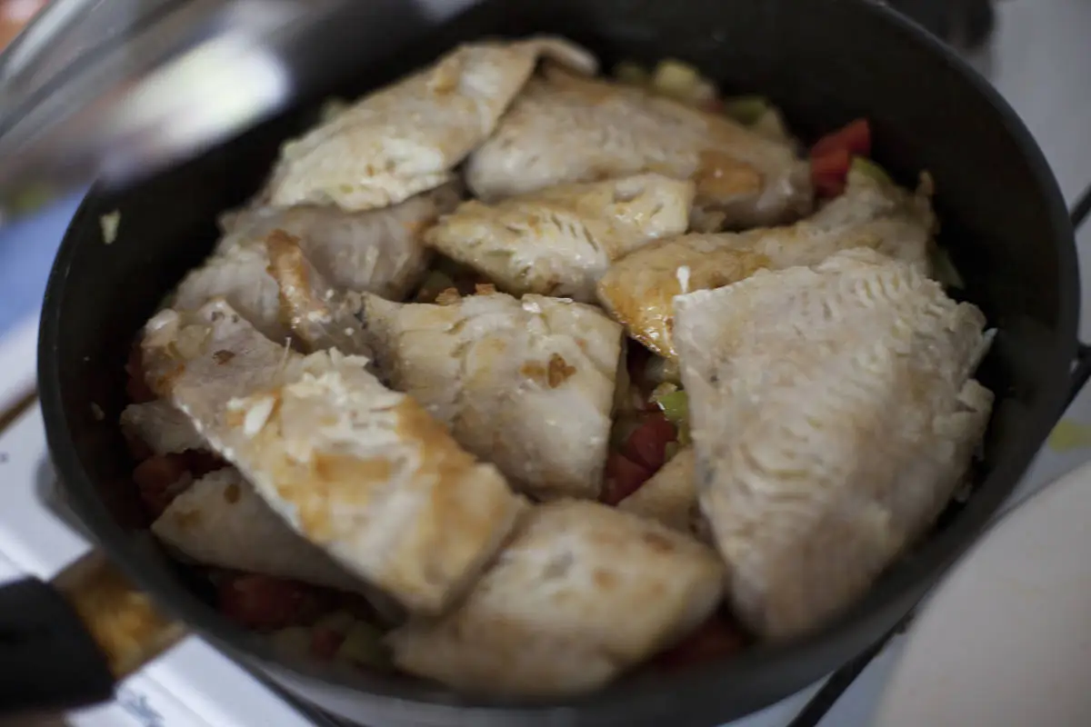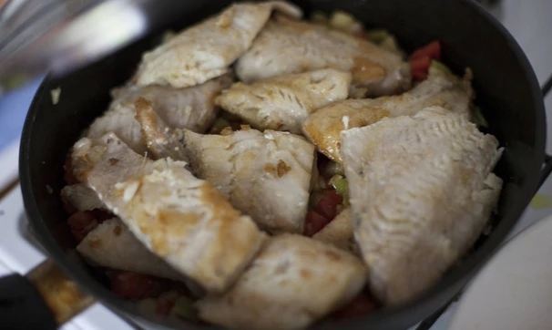 Морской окунь с овощами