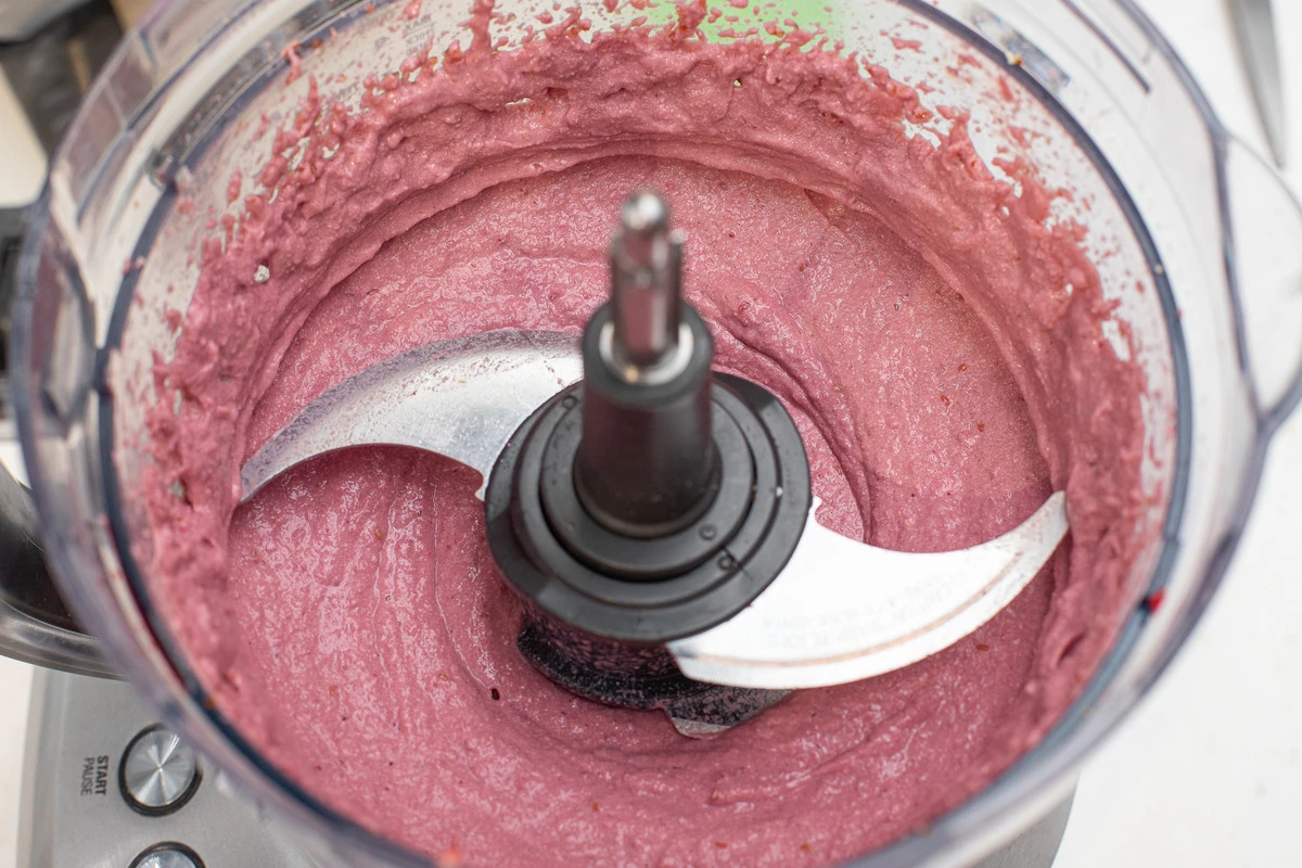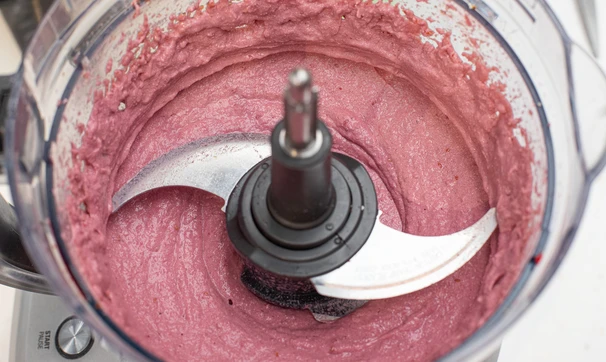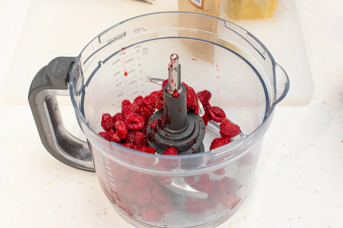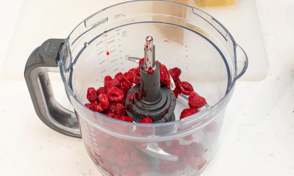 Малину выложите в чашу кухонного комбайна или блендера. Заранее размораживать не нужно. Ягоды можете добавлять постепенно: сначала положить 200 г, при необходимости после измельчения добавляя ещё.