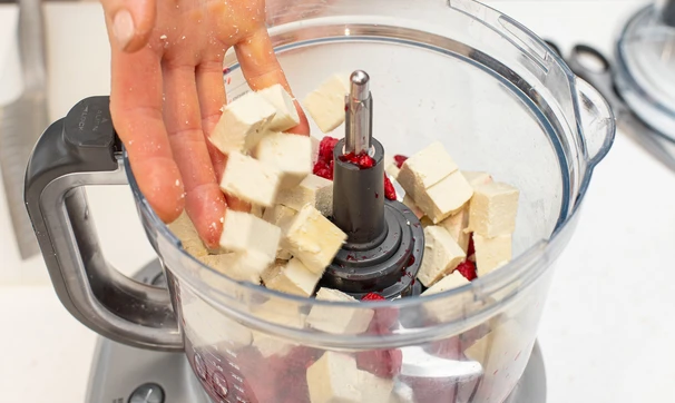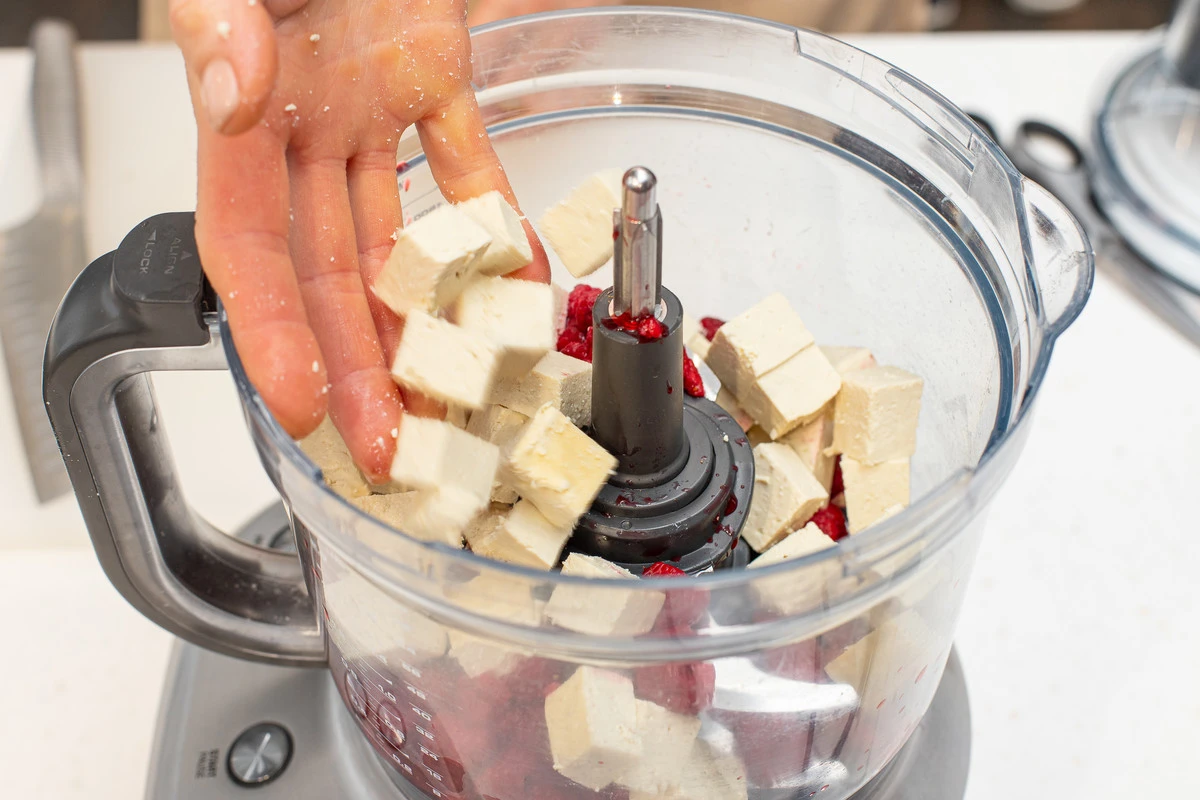 Добавьте к малине сахар и положите тофу. Можете влить сироп от варенья, заменив им сахар.