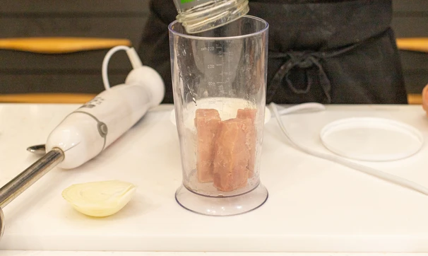 Кусочки тунца выложите в стакан блендера, жидкость из банки пока не выливайте.