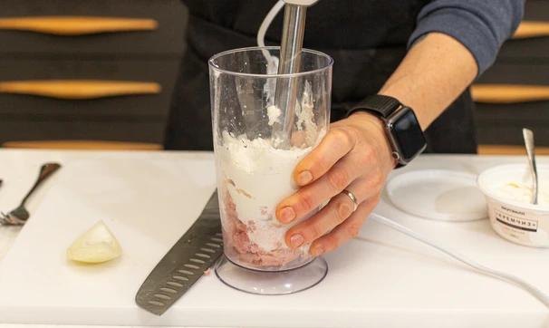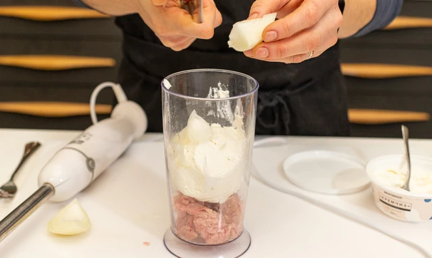 Добавьте к тунцу творожный сыр и четвертинку белого лука, пробейте всё вместе до однородности.