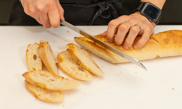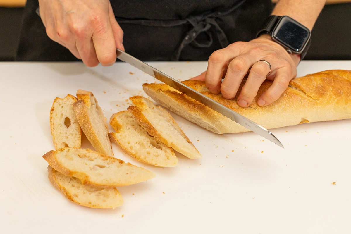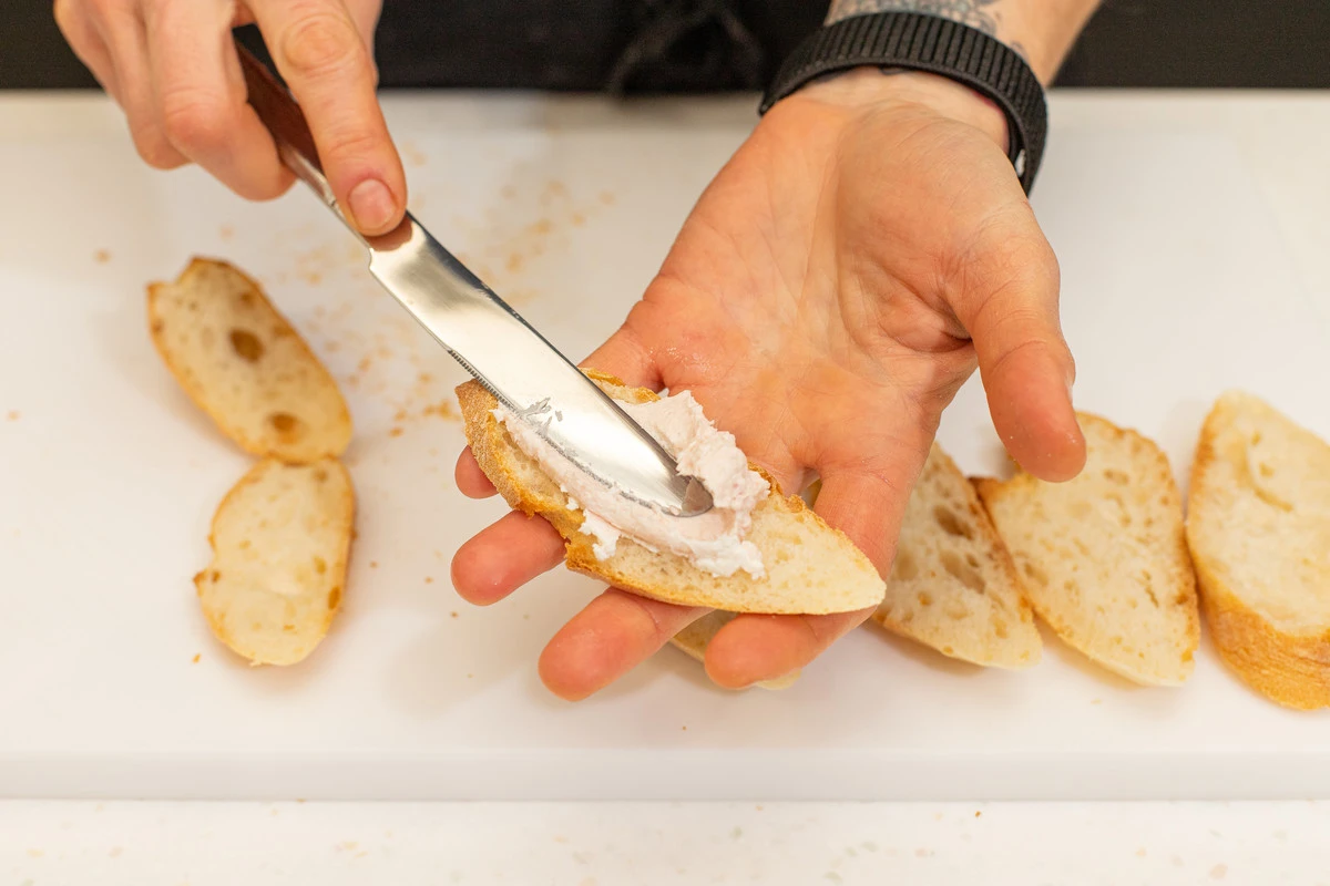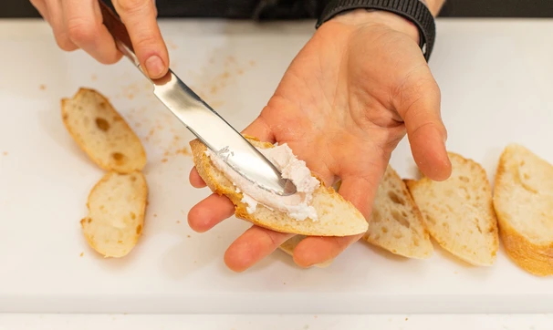 Нарежьте багет красивыми ломтиками, выложите на противень, сбрызните оливковым маслом и посыпьте листиками тимьяна. Подсушите в духовке при 200 °C около 5 минут или поджарьте на гриле.