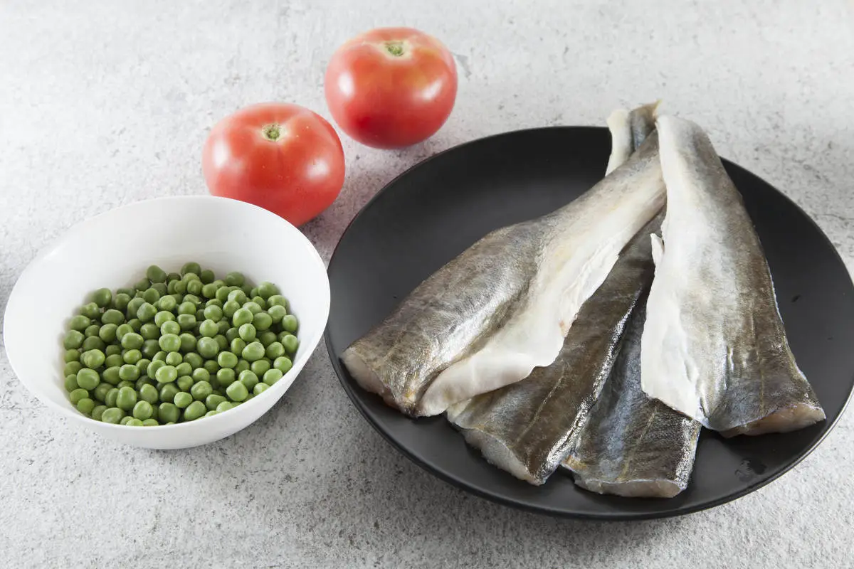 Навага с помидорами и зеленым горошком