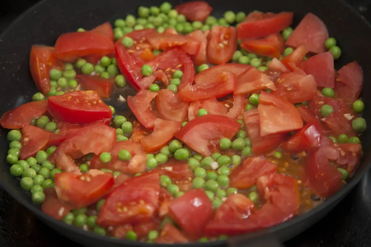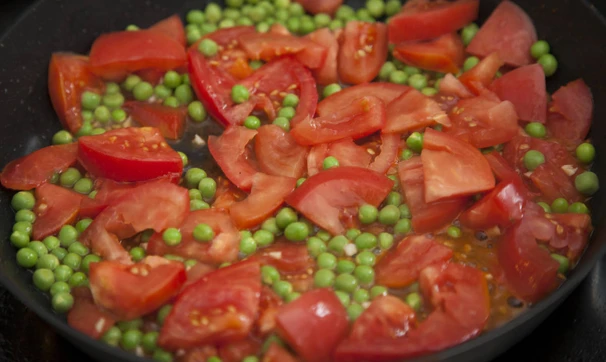 Горошек выньте из стручков, если они жесткие, совсем молодой горошек можно готовить целиком, помидор нарежьте ломтиками.