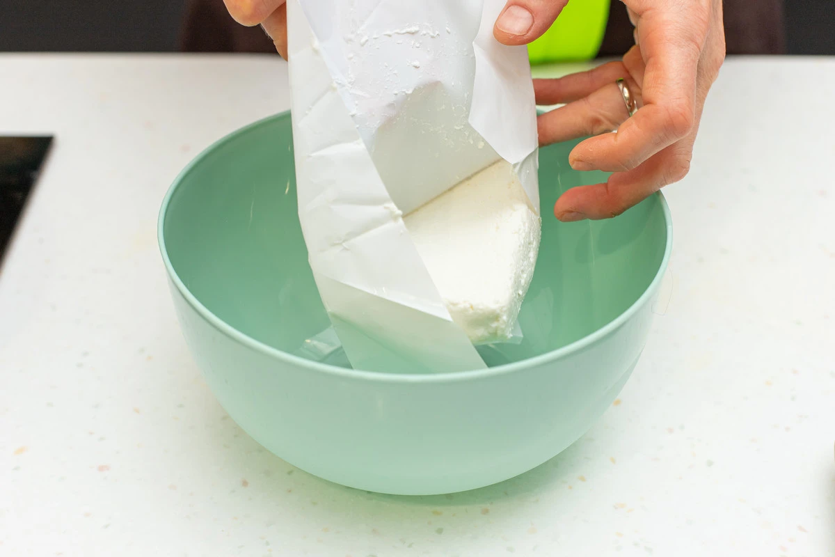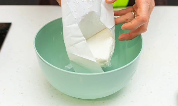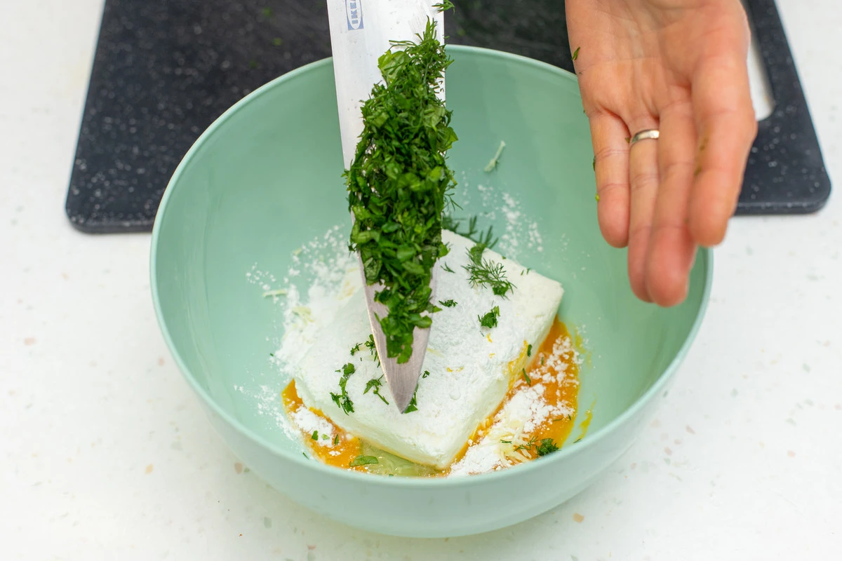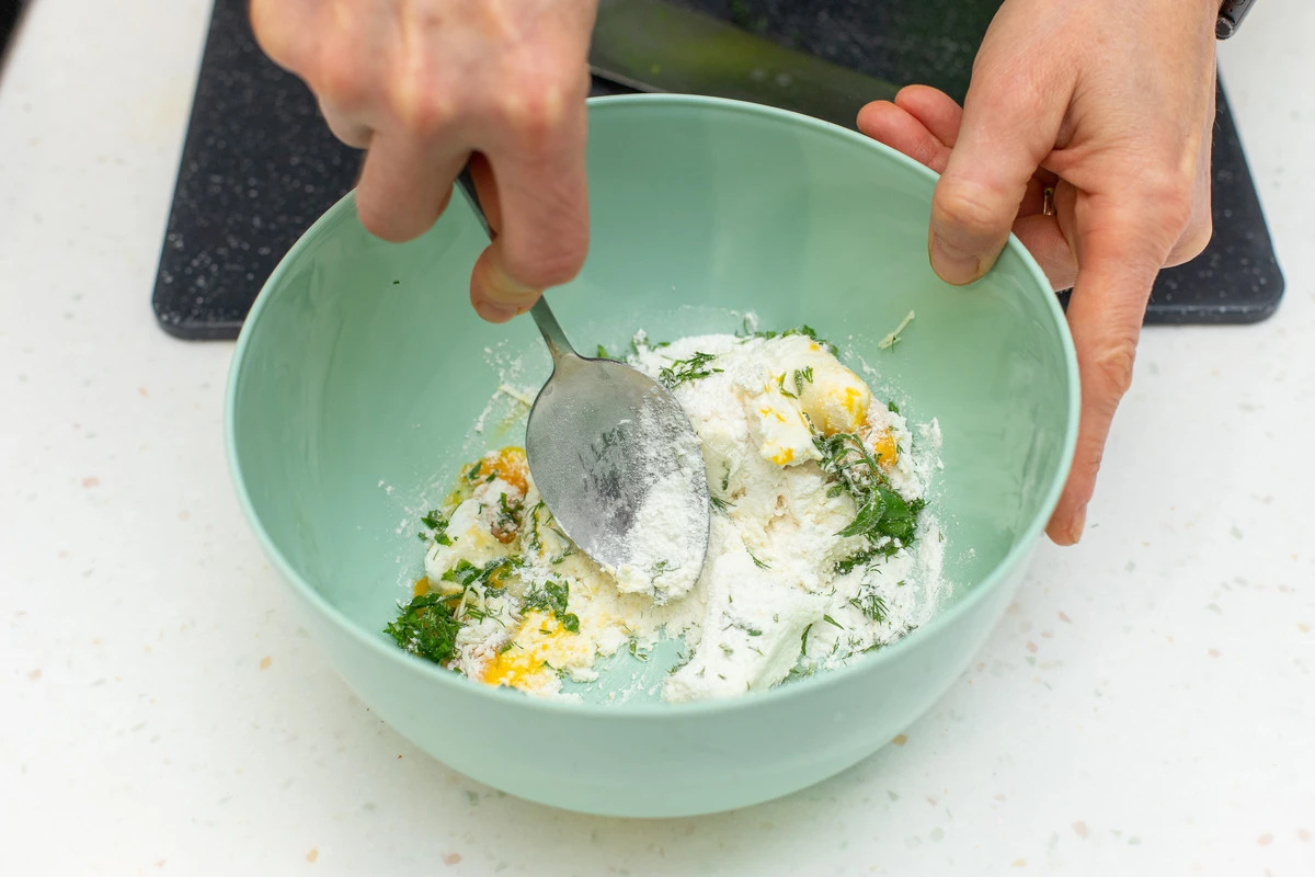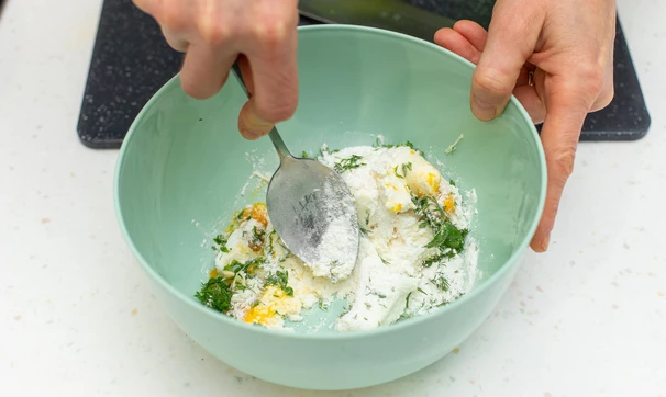 Добавьте к творогу желток и одну столовую ложку рисовой муки, посолите.