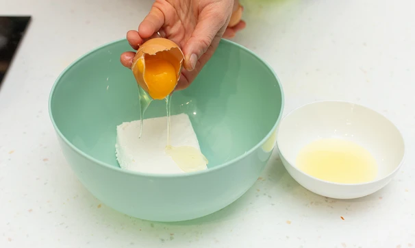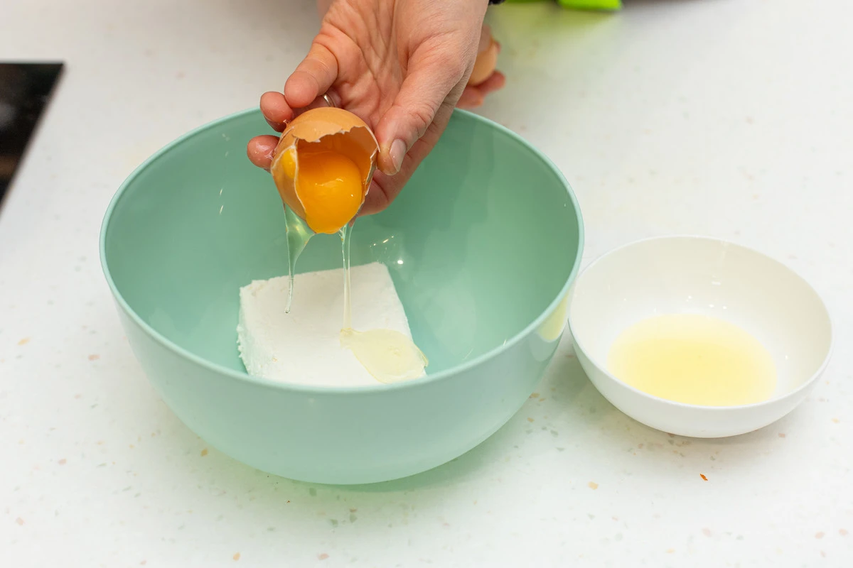 Творог выложите в миску (кстати, для этих сырников можно использовать как обычный 9%, так и специальный творог для сырников). Яйцо разбейте и отделите желток от белка, белок нам не понадобится.
