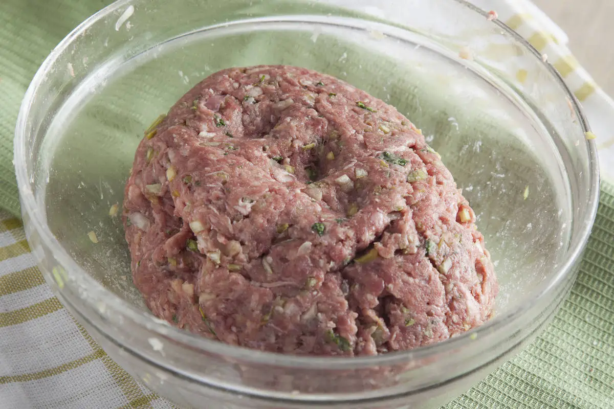 Хорошо вымесите фарш руками и отбейте.