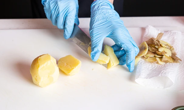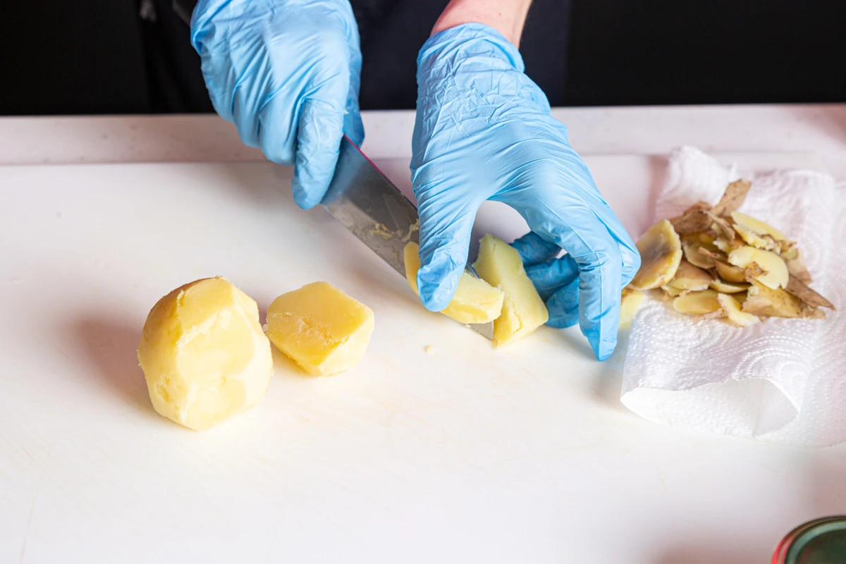 Очистите картофель и нарежьте его крупными дольками, а яйца пополам.