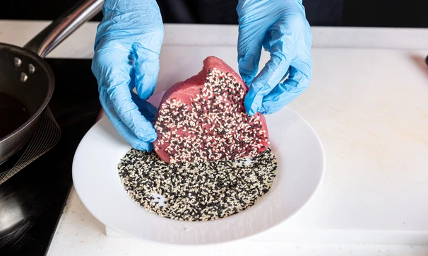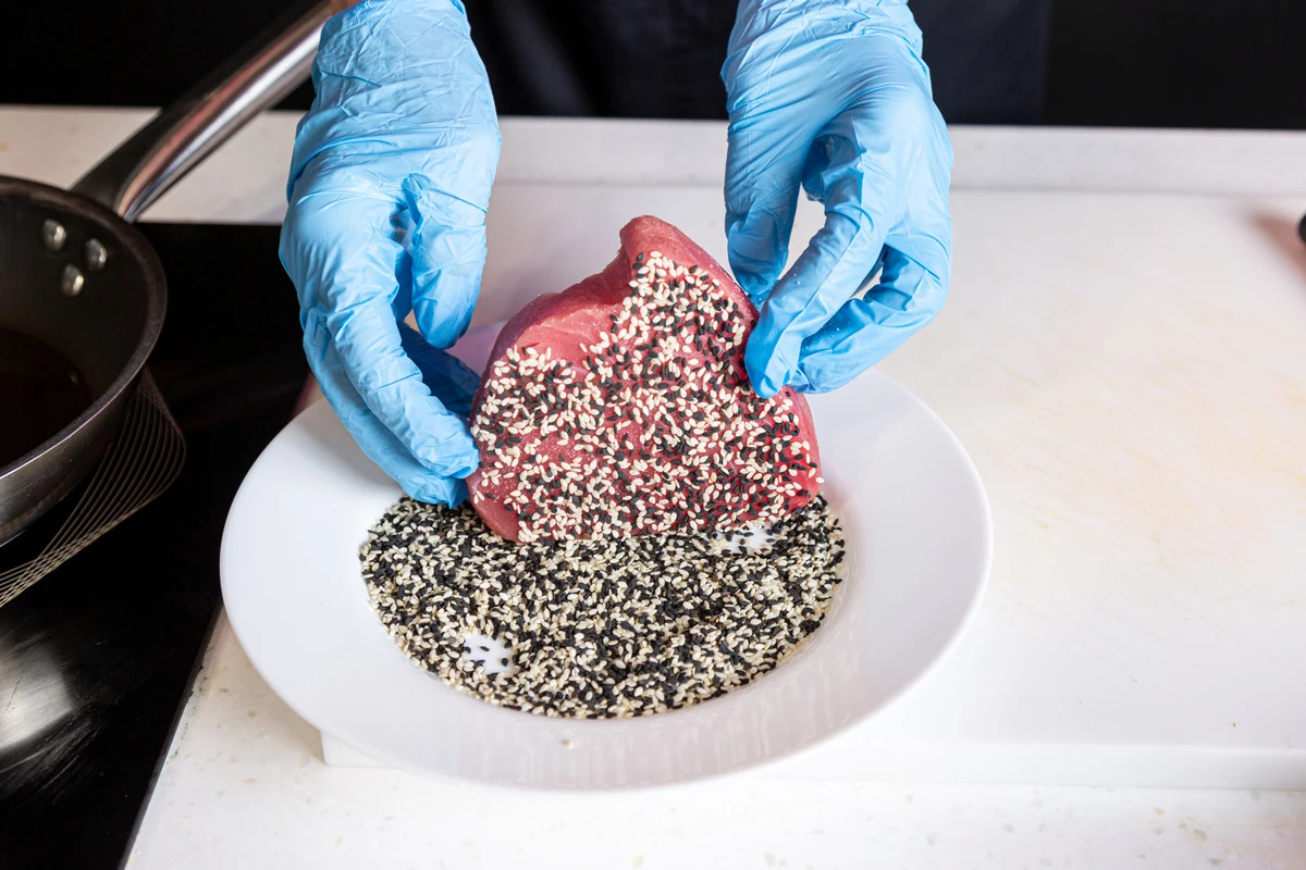 Промокните стейк тунца салфеткой, слегка посолите и поперчите. Обмакните тунец со всех сторон в кунжуте.