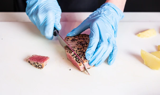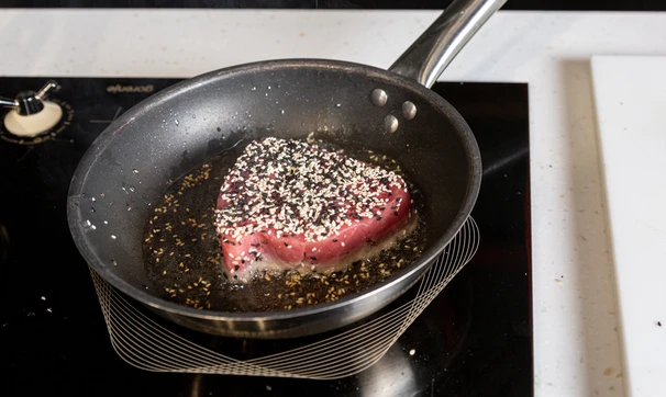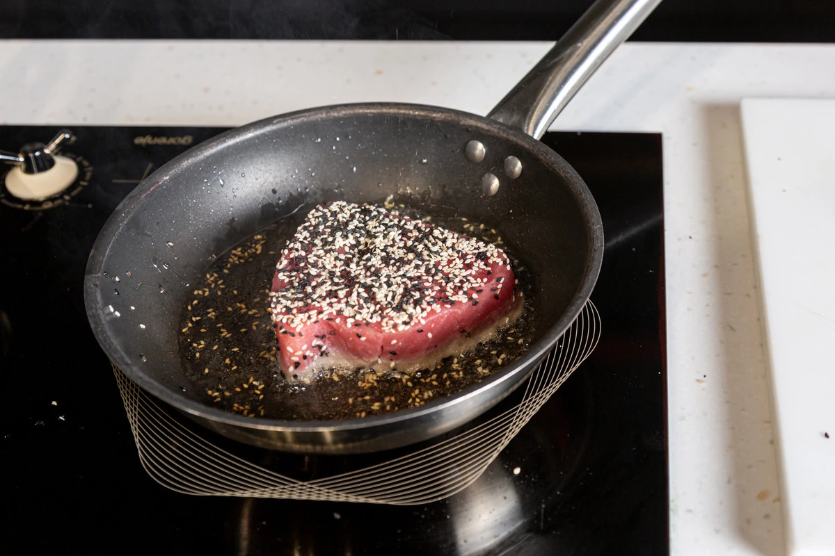 На сковороде-гриль с растительным маслом обжаривайте тунец по 3 минуты с каждой стороны.