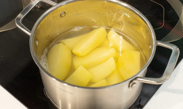 Картофель очистите, крупно нарежьте. Отварите до готовности (готовность проверьте ножом — если лезвие легко входит в клубень и выходит, значит, готов). Немного остудите. Воду слейте.