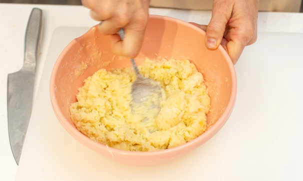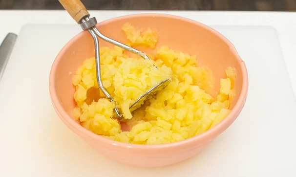 Выложите картофель в миску, помните толкушкой, добавьте щепотку чёрного молотого перца и соль, перемешайте.