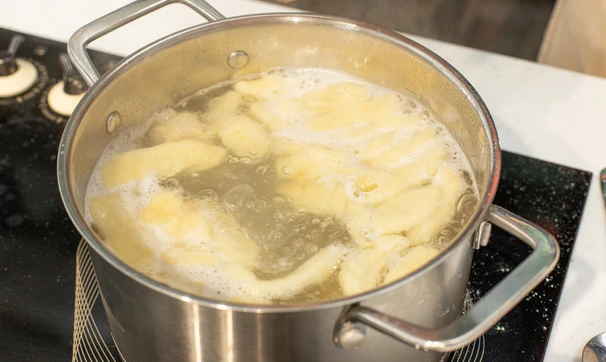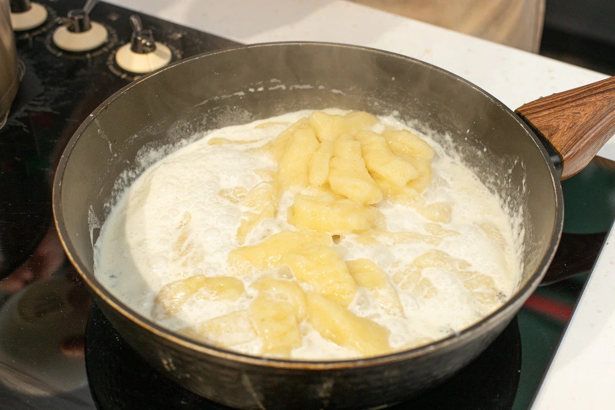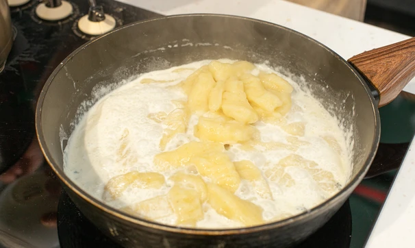 Вскипятите воду в большой кастрюле. Посолите — понадобится примерно 1 ч. ложка соли на литр воды. Сформируйте ньокки. Если будете делать узор вилкой, каждый раз обваливайте её в муке. Забросьте ньокки в кипящую воду и варите на среднем огне 3 минуты после того, как они всплывут.