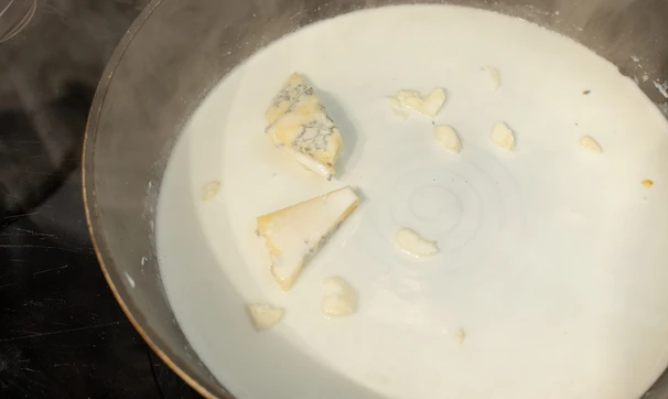 Чеснок мелко нарежьте. Разогрейте сухую сковороду, выложите в неё чеснок, добавьте сливки, нарезанную горгонзолу и готовьте, помешивая силиконовой лопаткой. Сыр должен полностью расплавиться, а соус стать однородным.