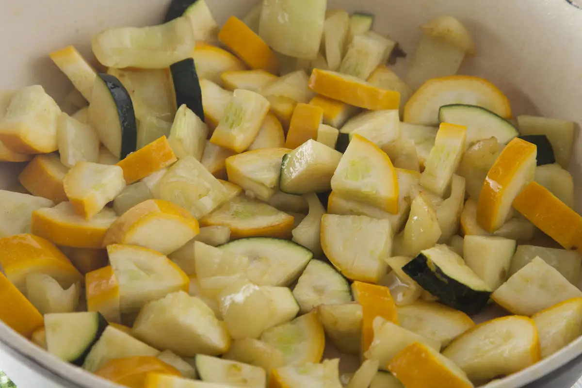 Цукини нарежьте половинками кружочков, болгарский перец и помидоры крупными кубиками.
