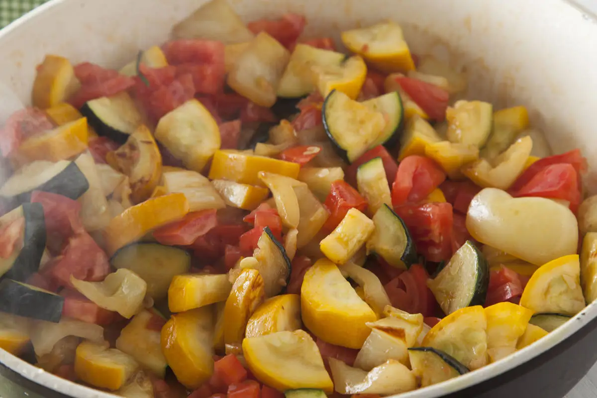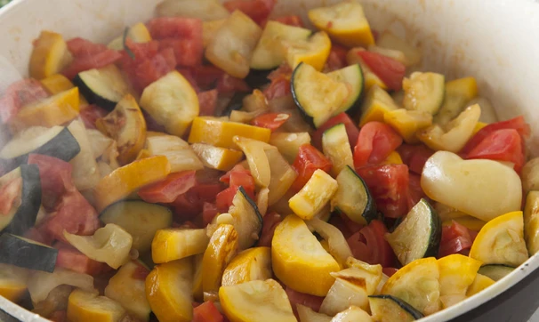 Обжарьте в оливковом масле цукини и болгарский перец на небольшом огне, минут через пять добавьте помидоры, перемешайте.