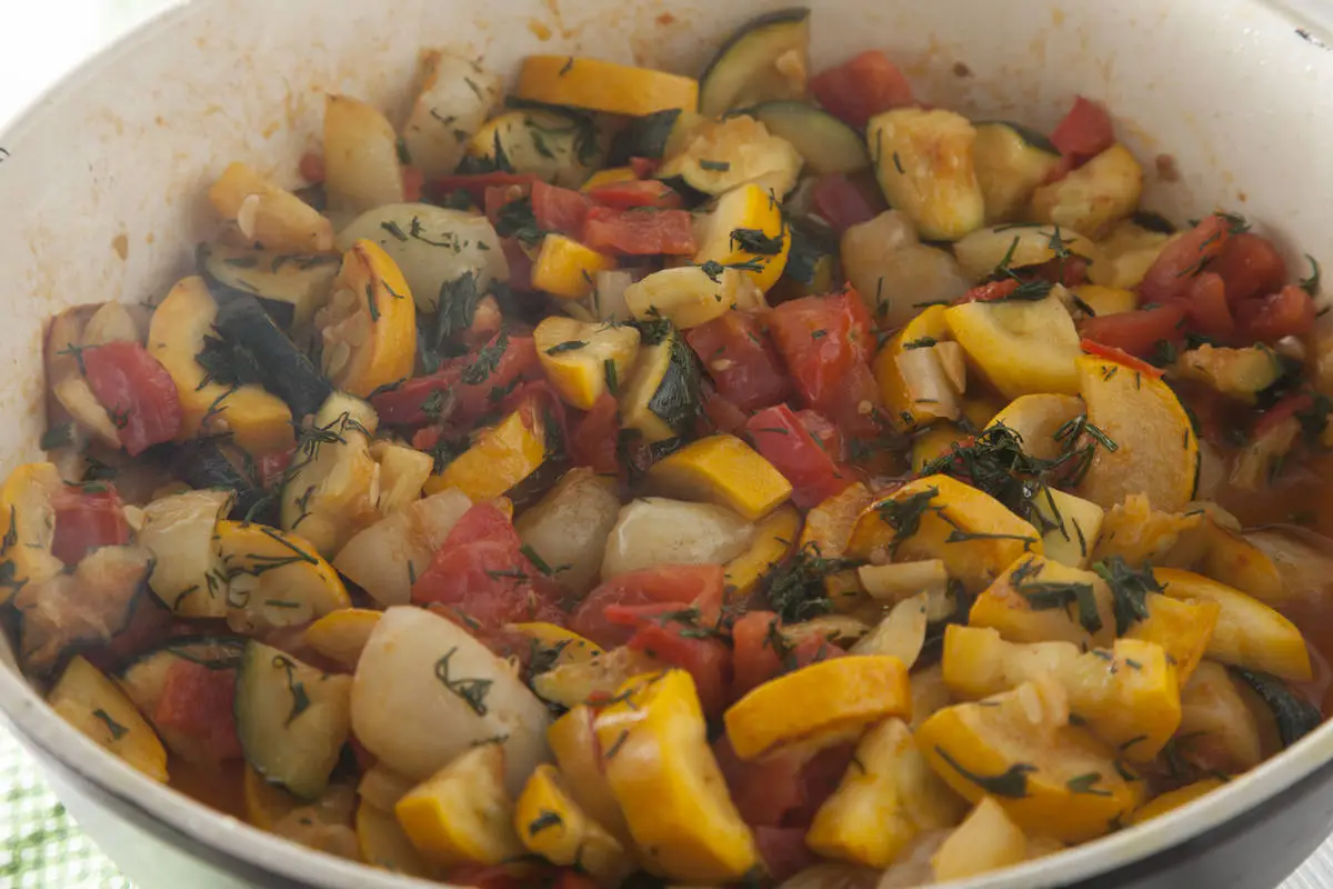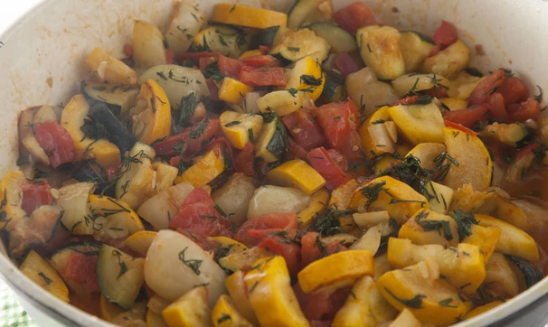 Мелко порубите чеснок и укроп, добавьте к готовому рататую, перемешайте и снимите с огня.