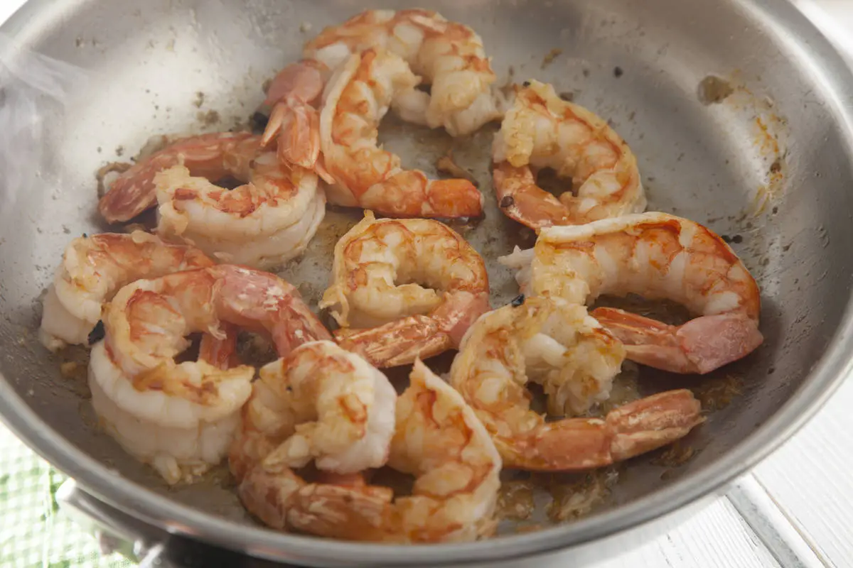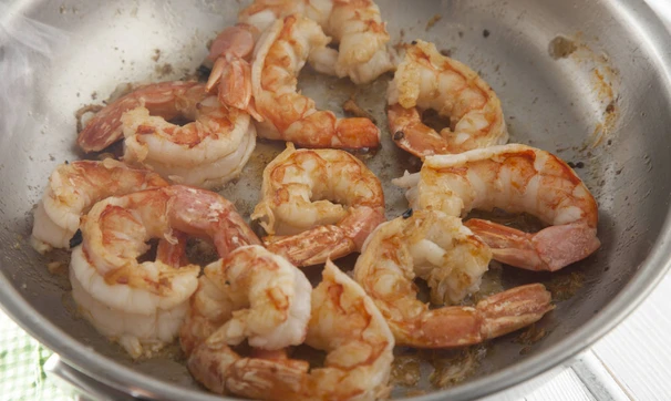 В другой сковороде разогрейте оливковое масло и выложите креветки так, чтобы между ними оставалось место, если все креветки не помещаются на сковороде, пожарьте в два приема. Жарьте на одной стороне минуту, не больше, переверните каждую и жарьте еще 30 секунд, креветки готовы!