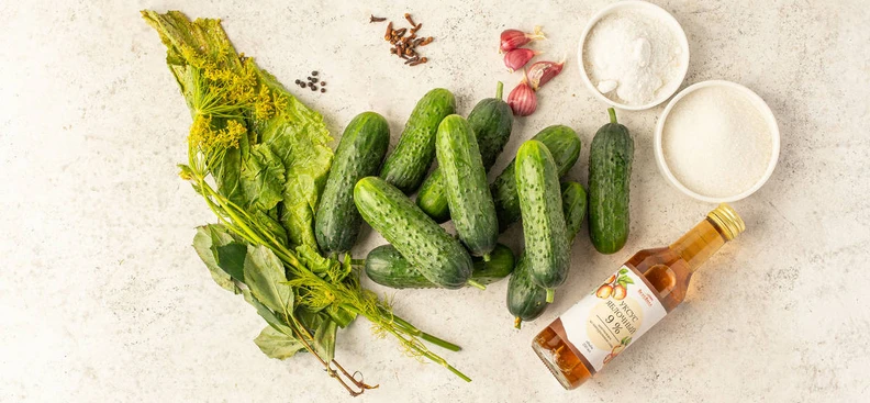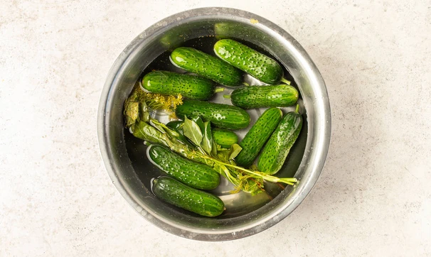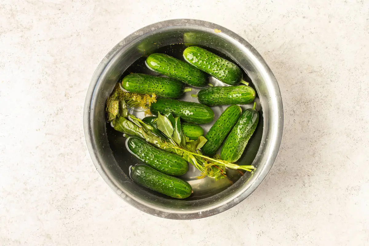 Огурцы вымойте, залейте холодной водой вместе с зеленью для засолки и оставьте на час.