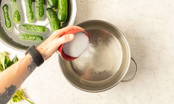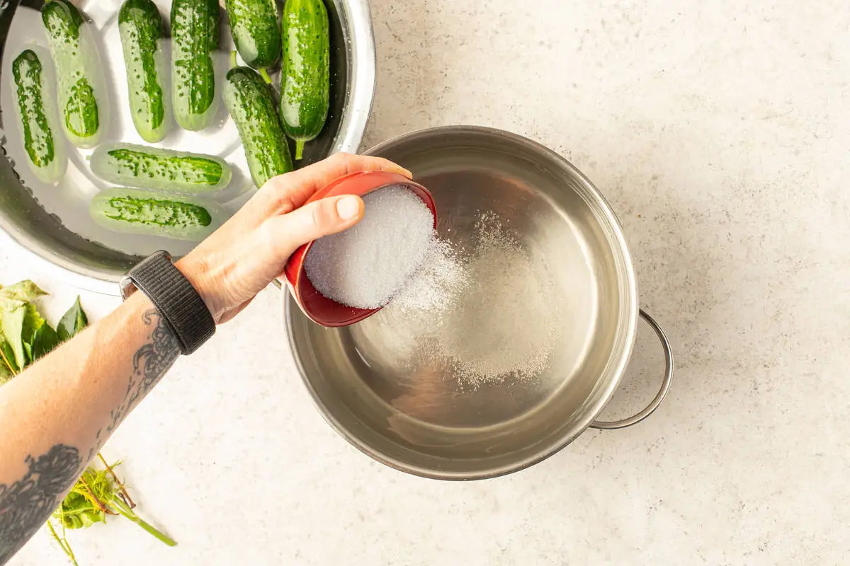 Для рассола растворите в воде соль и сахар, доведите до кипения.