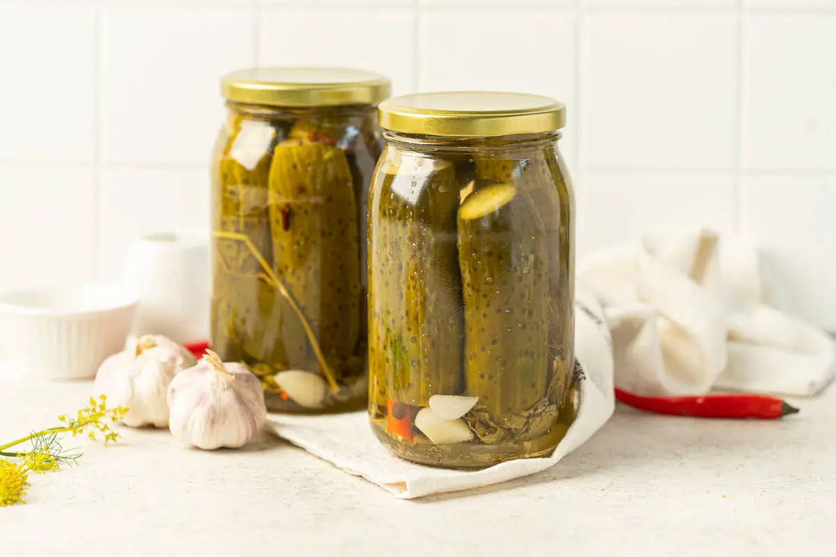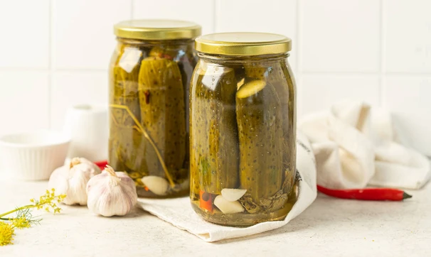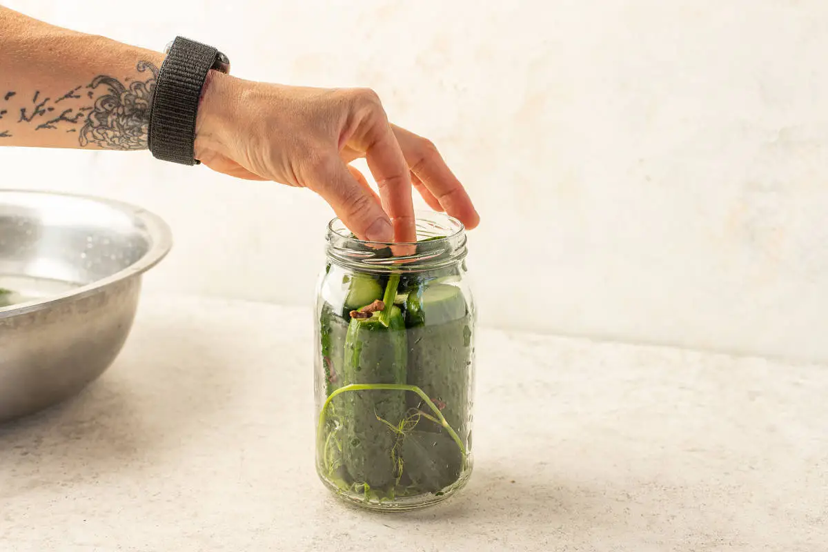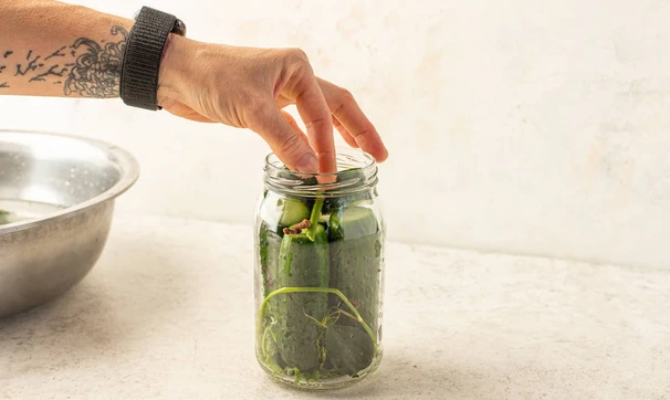 У огурцов отрежьте кончики. Плотно утрамбуйте огурцы в банки, перемежая зубчиками чеснока, зеленью и специями.