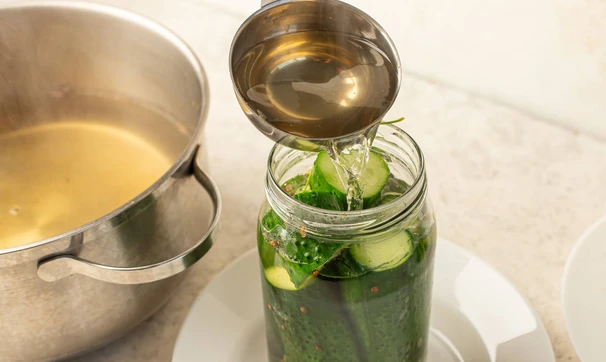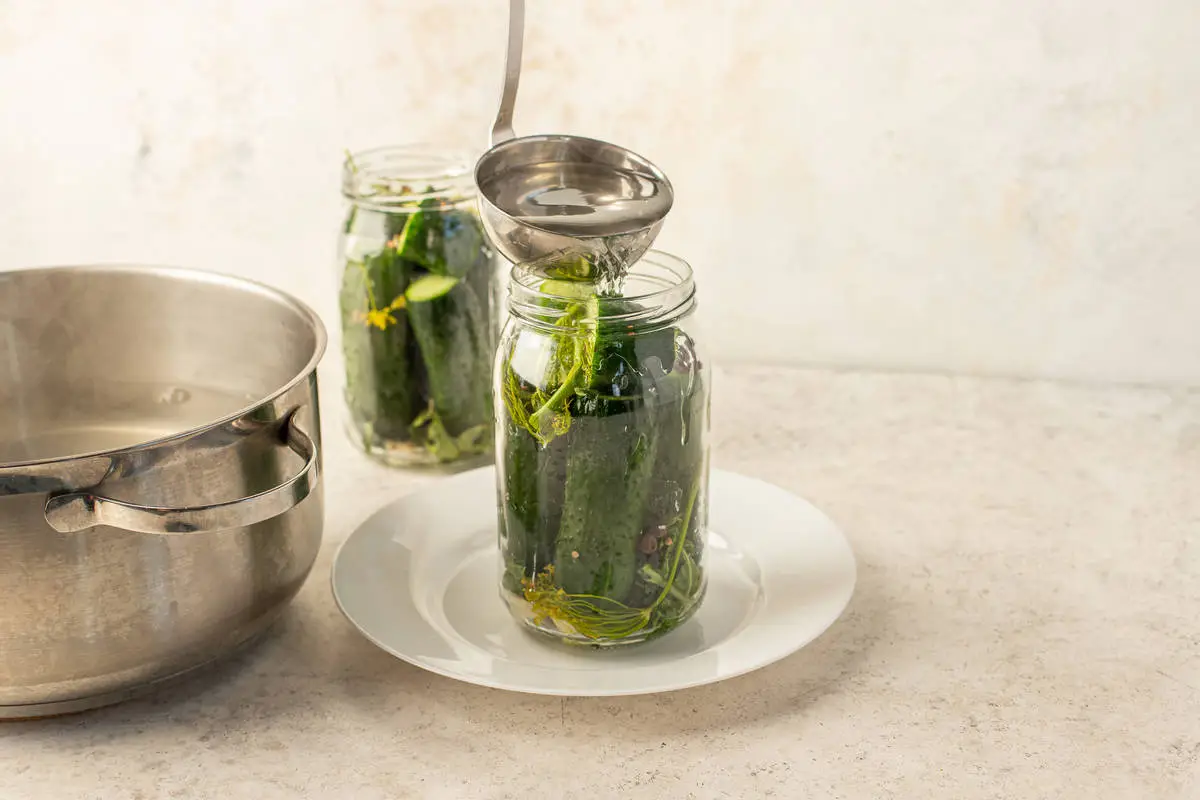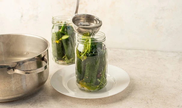 Залейте огурцы в банках кипящим рассолом и оставьте на 10 минут.