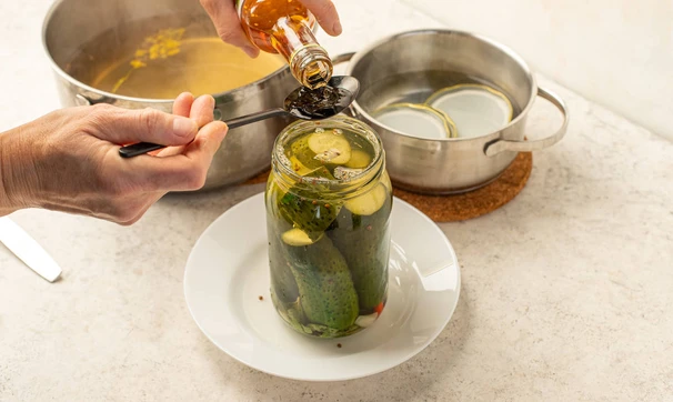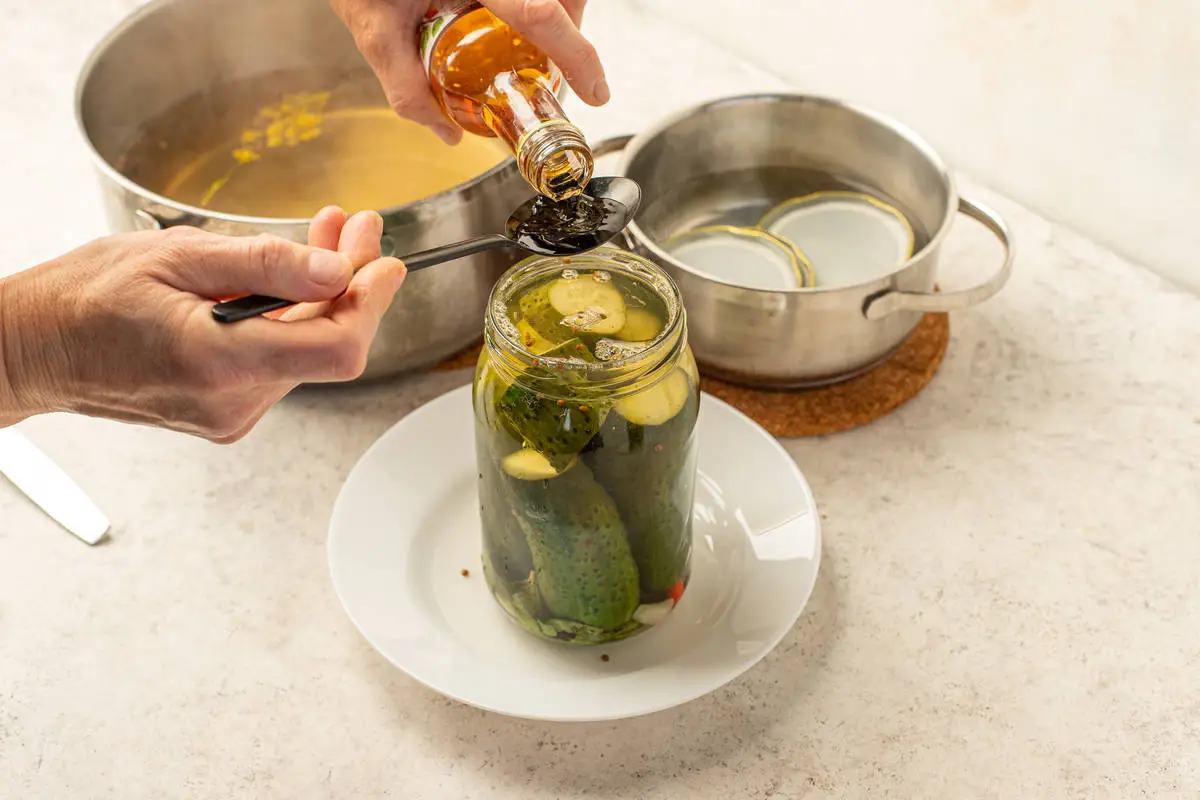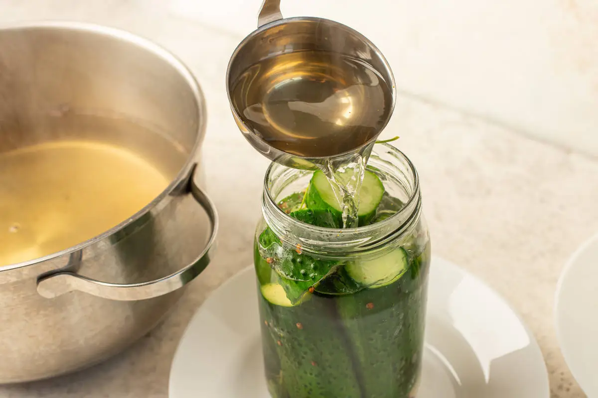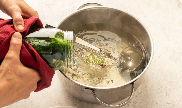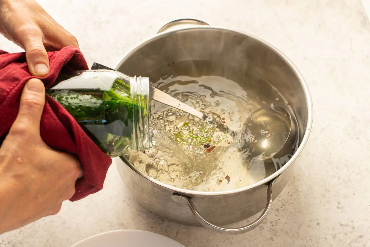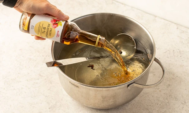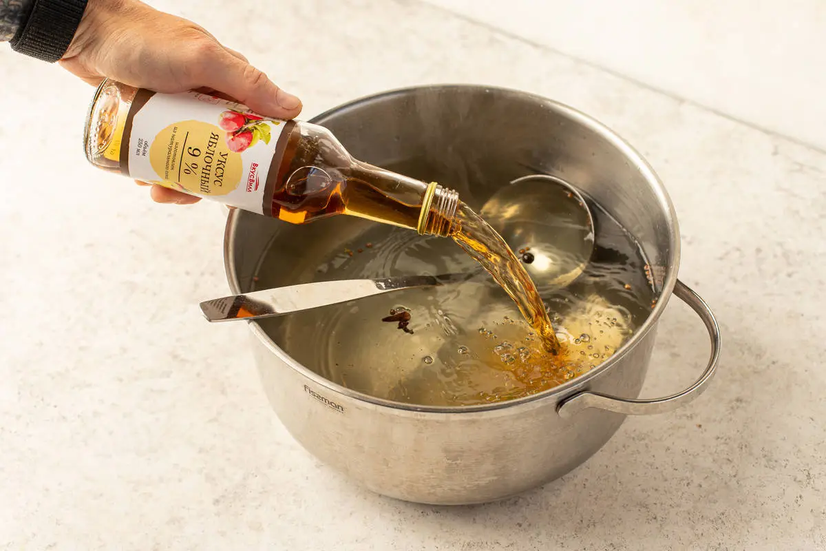 Последний раз слейте рассол в кастрюлю, доведите до кипения и добавьте уксус.