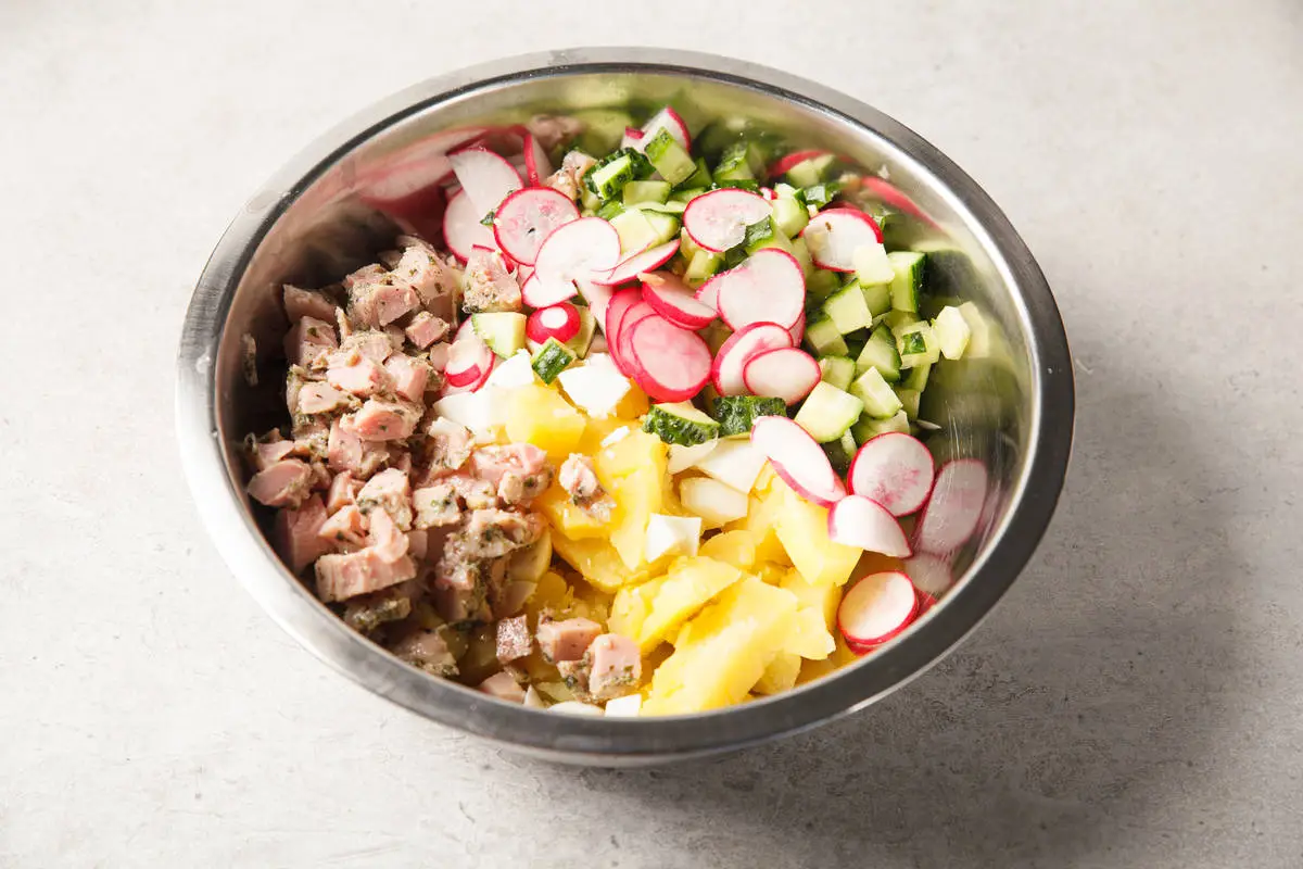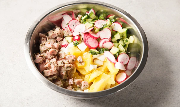 Картофель очистите и отварите до готовности, остудите. Яйца сварите вкрутую, очистите. Белки варёных яиц, картофель, огурцы и филе цыплёнка нарежьте кубиками. Редис можно нарезать кубиками или кружочками — для красоты. Всё перемешайте.