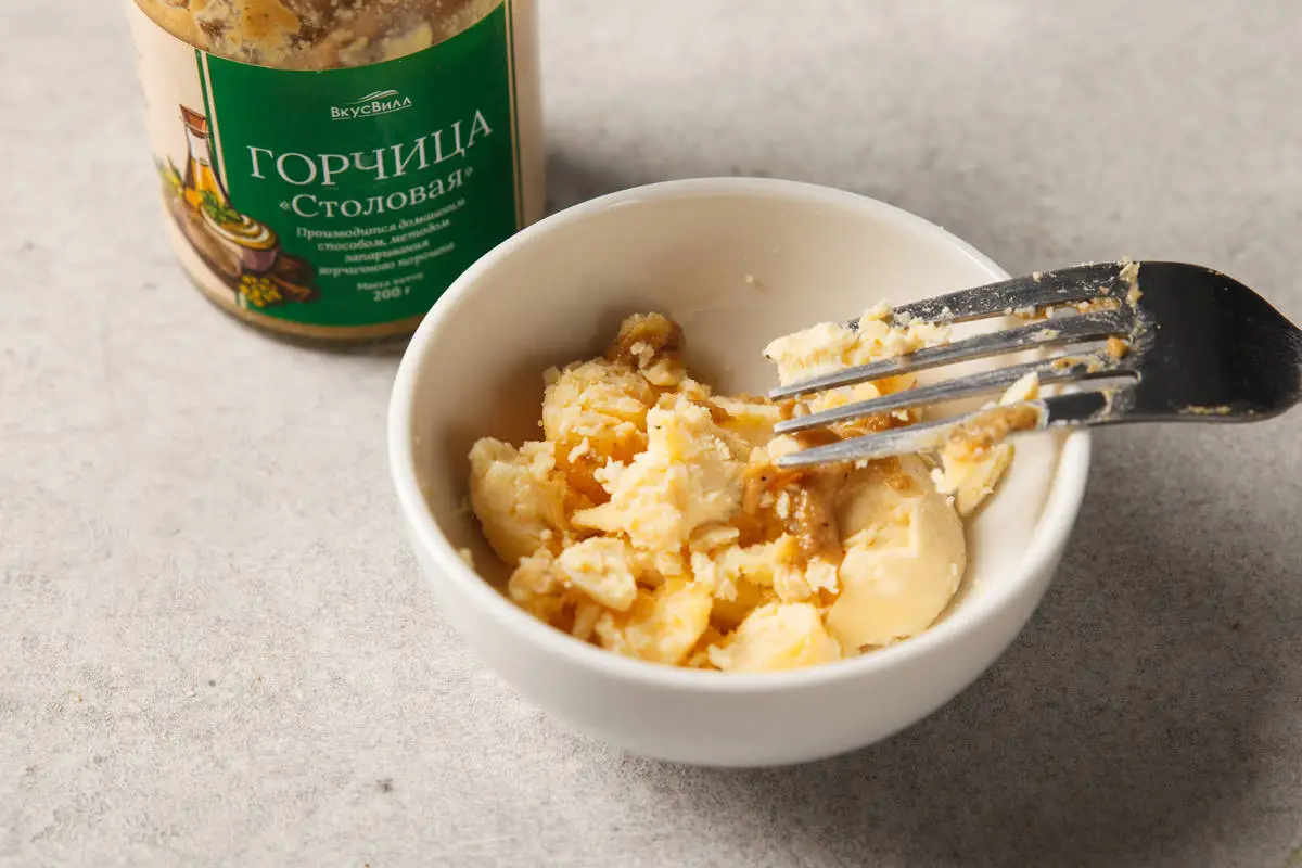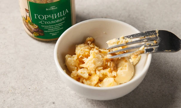 Желтки яиц разотрите вилкой с горчицей и солью, добавив немного кваса, чтобы получилась консистенция сметаны. Можно добавить чуть-чуть хрена, если любите.