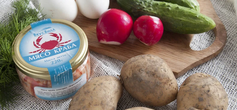 Откройте банку с крабовым мясом, удалите хитиновые пластинки, крупные фаланги разрежьте пополам, мелкие используйте целиком, смешайте с овощами.