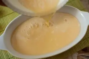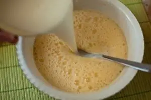 Яйца взбить с солью до образования пены, влить смесь молоко+вода с мукой и продолжить взбивать. Общее время взбивания блендером или миксером займёт 3 минуты.